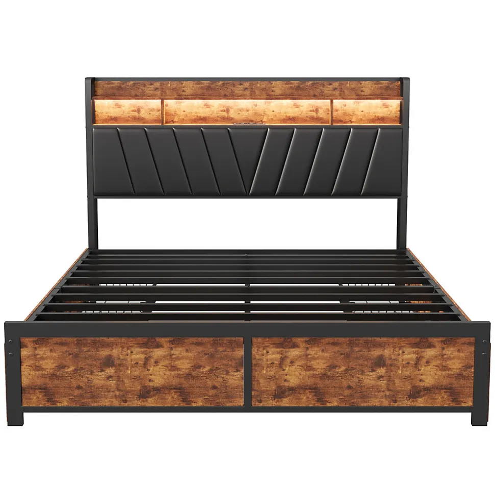 ✦Description du produit1. Éclairage LED Synchronisé avec Musique et Contrôle Intelligent: Profitez de la flexibilité de la bande LED multicolore contrôlable via télécommande ou smartphone. Synchronisez les lumières avec votre musique pour créer une atmosphère immersive et unique.2. Port USB et Prise Européenne pour Confort de Recharge: La tête de lit est équipée de deux ports USB et de prises européennes, parfait pour charger plusieurs appareils en même temps. Pratique et efficace, pour un confort maximal dans votre chambre.3. Tête de Lit avec Étagère de Rangement Pratique: Optimisez votre espace avec la tête de lit à deux niveaux qui offre des espaces de rangement supplémentaires. Gardez vos livres, réveils et autres objets importants à portée de main, avec un design élégant et fonctionnel.4. Rangement Intégré avec 4 Grands Tiroirs: Ne manquez jamais d’espace de rangement grâce aux quatre tiroirs spacieux situés sous le lit. Idéal pour organiser vos affaires et garder votre chambre bien ordonnée, même dans les petits espaces.✦Spécifications du produit :Matériau : Bois + Métal + Simili cuir- Dimensions (LxPxH) : 217 x 180 x 112.5 cm- Matelas applicable : 180 x 200 cm- Épaisseur du matelas adaptée : 25 cm – Charge maximale : 300 kg- Couleur : noir, Brown- Distance tête de lit : 25 cm- Nombre de colis : 2✦ Remarque : ※ Ce produit est livré en 2 colis, qui peuvent arriver séparément. Merci de votre patience.※ Une erreur de mesure de 2 à 3 cm peut survenir en raison des mesures manuelles.※ Des différences de couleur peuvent apparaître en raison de l’éclairage. Veuillez vous référer au produit réellement reçu.※ Si vous avez des questions lors de l’installation, veuillez nous contacter dès que possible.