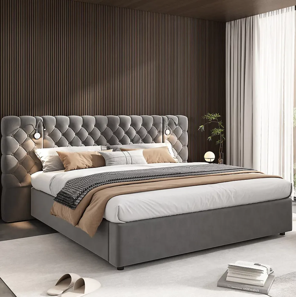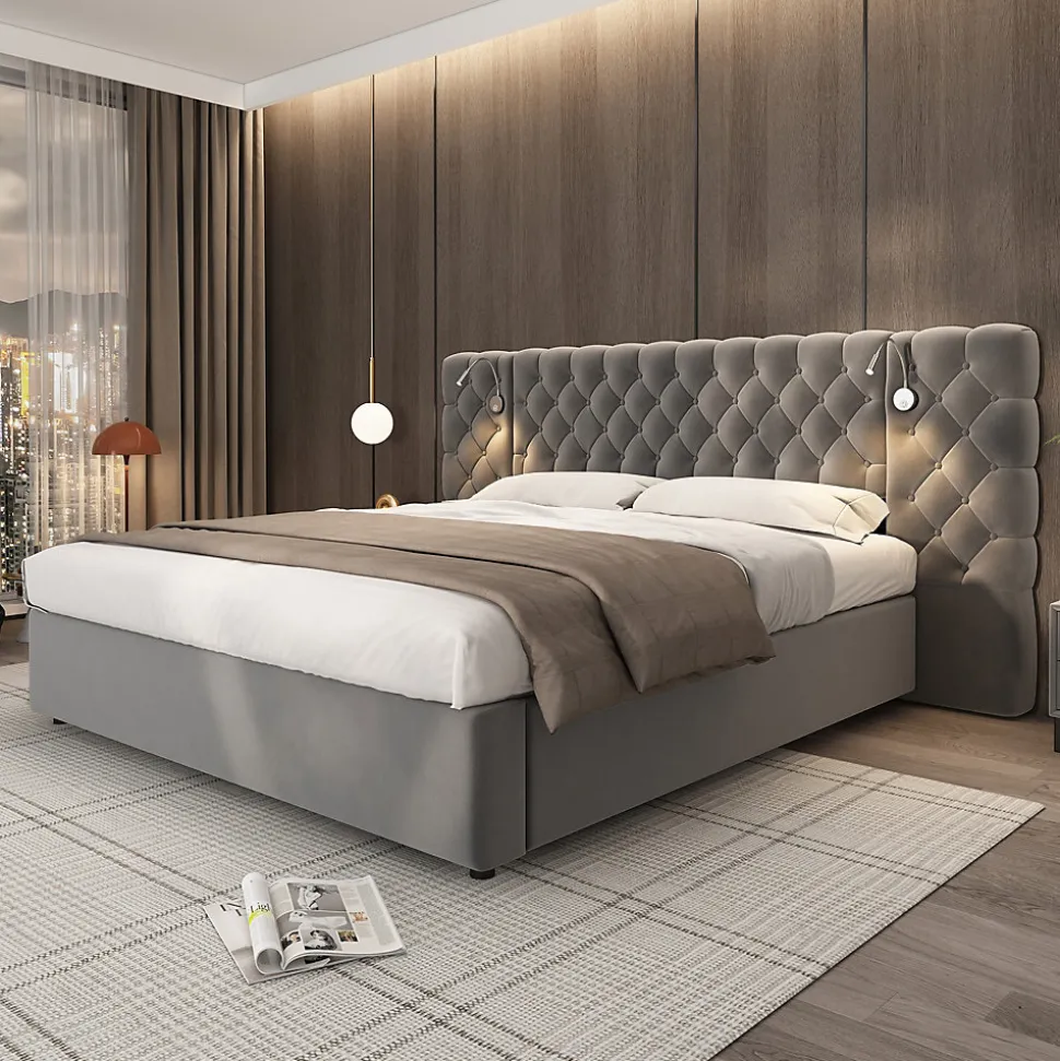 - Design élégant et contemporain avec large tête de lit capitonnée tapissée en velours gris et liseuse intégrée; confort pour la lecture et esthétique raffinée apportant une ambiance chaleureuse