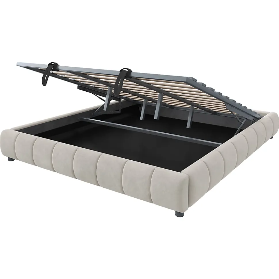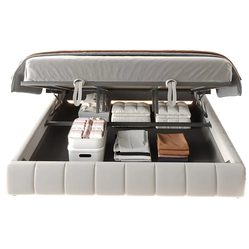 - Rangement hydraulique spacieux sous le sommier, facile à lever pour accéder au coffre. Cadre métal et sommier solide offrant une capacité de charge de 300 kg, adapté aux usages quotidiens.