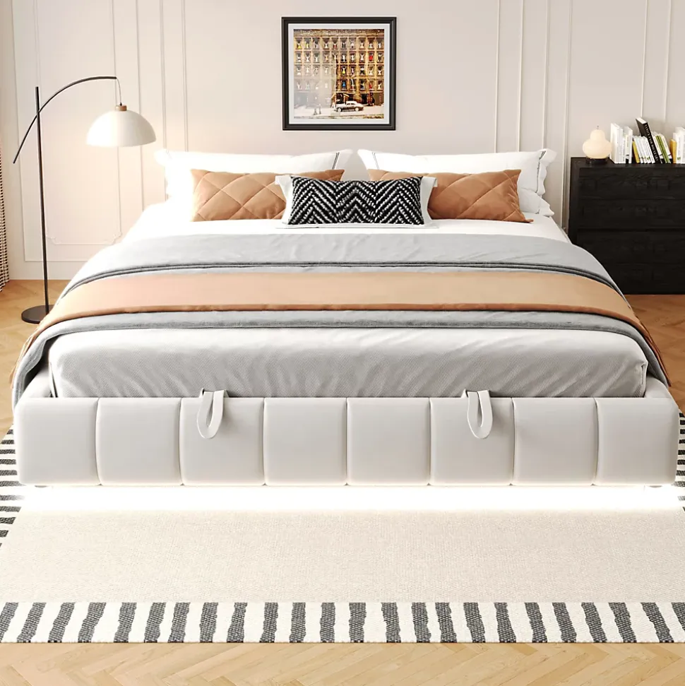 Design & styleCe canapé-lit sans tête de lit propose une silhouette épurée et modulable, pensée pour s’intégrer discrètement dans un studio, une chambre d’adolescent ou un intérieur contemporain. Le revêtement en flanelle beige apporte une texture chaleureuse et une finition veloutée, tout en restant neutre pour se coordonner à différents décors.Fonction coffre hydraulique & éclairage Système hydraulique facile à manœuvrer permettant de soulever l’ensemble du couchage pour accéder à un rangement volumineux et protégé. Barre LED blanche intégrée sous la structure pour un éclairage d’ambiance discret, adapté à la lecture ou aux soirées détendues. Conçu pour optimiser l’espace : recommande une épaisseur de matelas de 6-10 cm pour un usage confortable. Capacité de charge maximale : 300 kg, assurée par un sommier métallique et une construction stable.Matériaux & entretienStructure composée de panneaux MDF et contreplaqué, sommier métallique équipé de 12 lattes. Revêtement en flanelle facile d’entretien ; nettoyer les surfaces textiles avec un chiffon doux et éviter les produits agressifs pour préserver l’aspect et la couleur.Dimensions & spécificationsDimensions du couchage : 180×200 cm. Dimensions totales indiquées par le fabricant : 214,5x195x29,5 cm. Poids total du produit : 47,8 kg (poids colis total déclaré : 51,8 kg). Nombre de colis : 2. Charge maximale : 300 kg.Installation & emballageMontage complet requis, temps estimé environ 1 heure ; 2 à 3 personnes recommandées pour une manipulation sûre. Tous les éléments et la visserie sont fournis, éviter l’usage d’outils électriques lors de l’assemblage. Produit livré en deux colis pouvant arriver séparément.