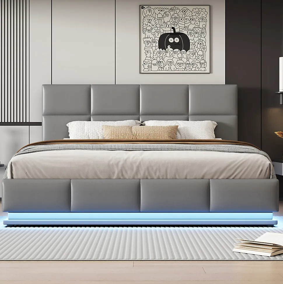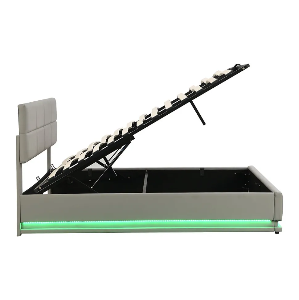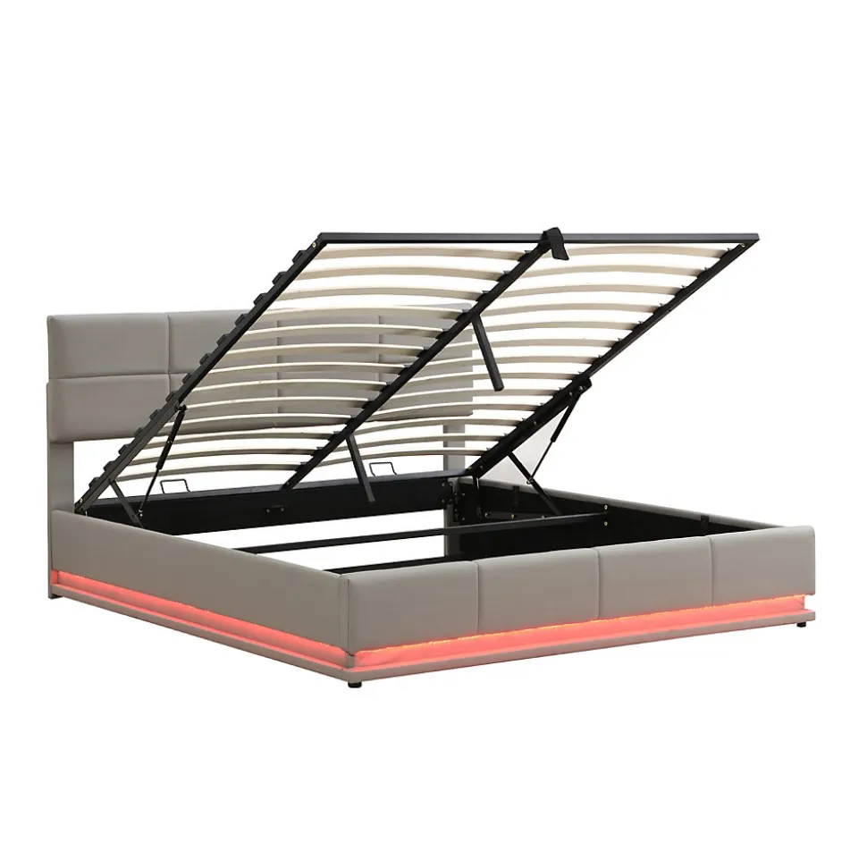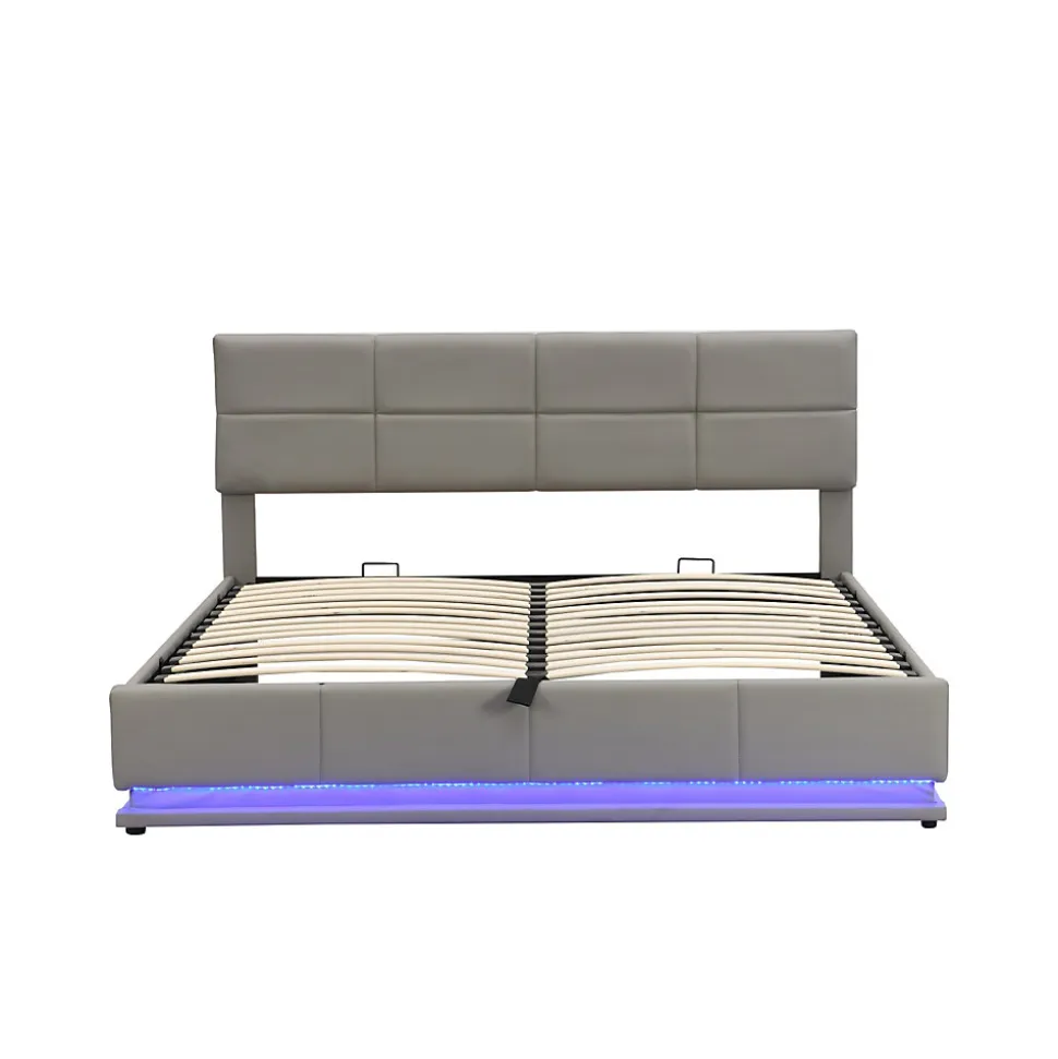 Design & styleCe lit 180×200 cm allie un revêtement en similicuir (PU) gris ciment à un éclairage LED intégré autour de l’assise et de la tête de lit. Les LED proposent 16 couleurs et 4 modes automatiques, pilotables par une télécommande 24 touches pour adapter l’ambiance selon vos envies.Fonctionnalité & rangement Coffre de rangement spacieux accessible grâce à un mécanisme hydraulique à double vérin, facilitant l’ouverture et la fermeture. Structure stable avec 24 lattes et renfort central métallique, capacité de charge maximale 300 kg pour maintenir la matelas sans affaissement. Hauteur de tête de lit réglable (91 / 101 cm) ; hauteur recommandée de la matelas : 15–25 cm.Matériaux & entretienStructure composée de panneaux MDF, éléments métalliques et revêtement en similicuir (PU) rembourré. Le cadre inclut une traverse centrale de soutien pour une durabilité accrue. Surface facile d’entretien : essuyer avec un chiffon doux et un produit non abrasif.Dimensions & livraisonDimensions totales : 200x181x91(101) cm. Surface de couchage : 180×200 cm. Poids total : 52,8 kg. Produit livré en 3 colis. Couleurs disponibles : gris ciment et blanc.Installation & emballageMontage requis, temps estimé 2 heures à deux personnes. Tous les accessoires et visseries sont fournis, tournevis inclus ; l’usage d’outils électriques est déconseillé. Matelas non inclus.