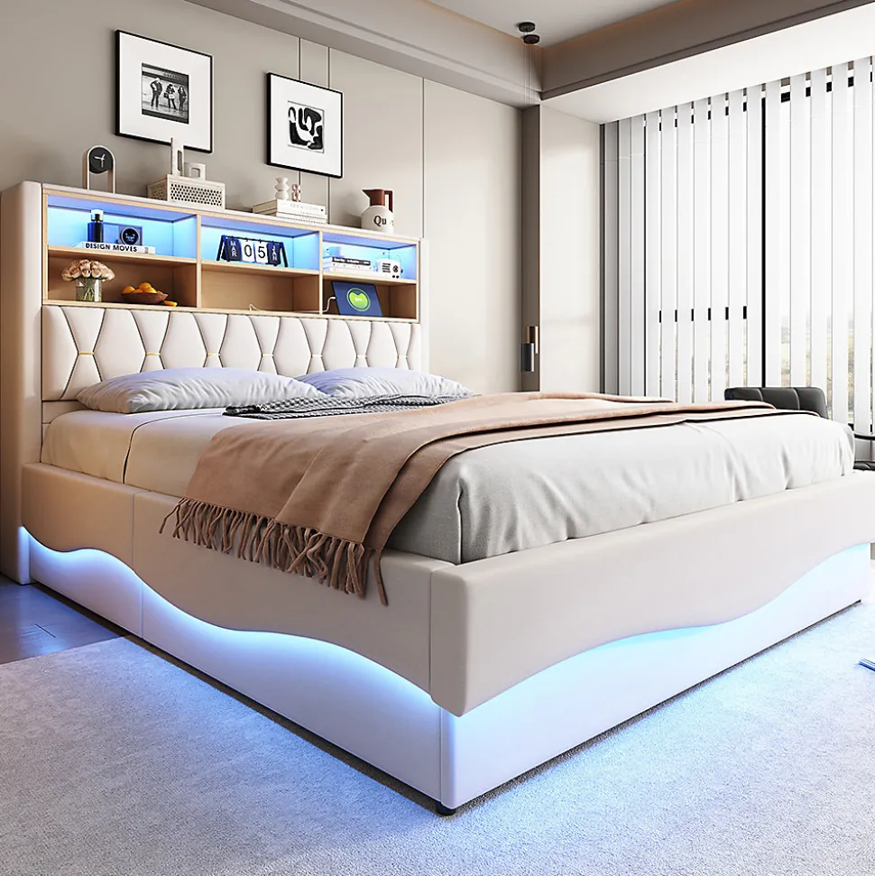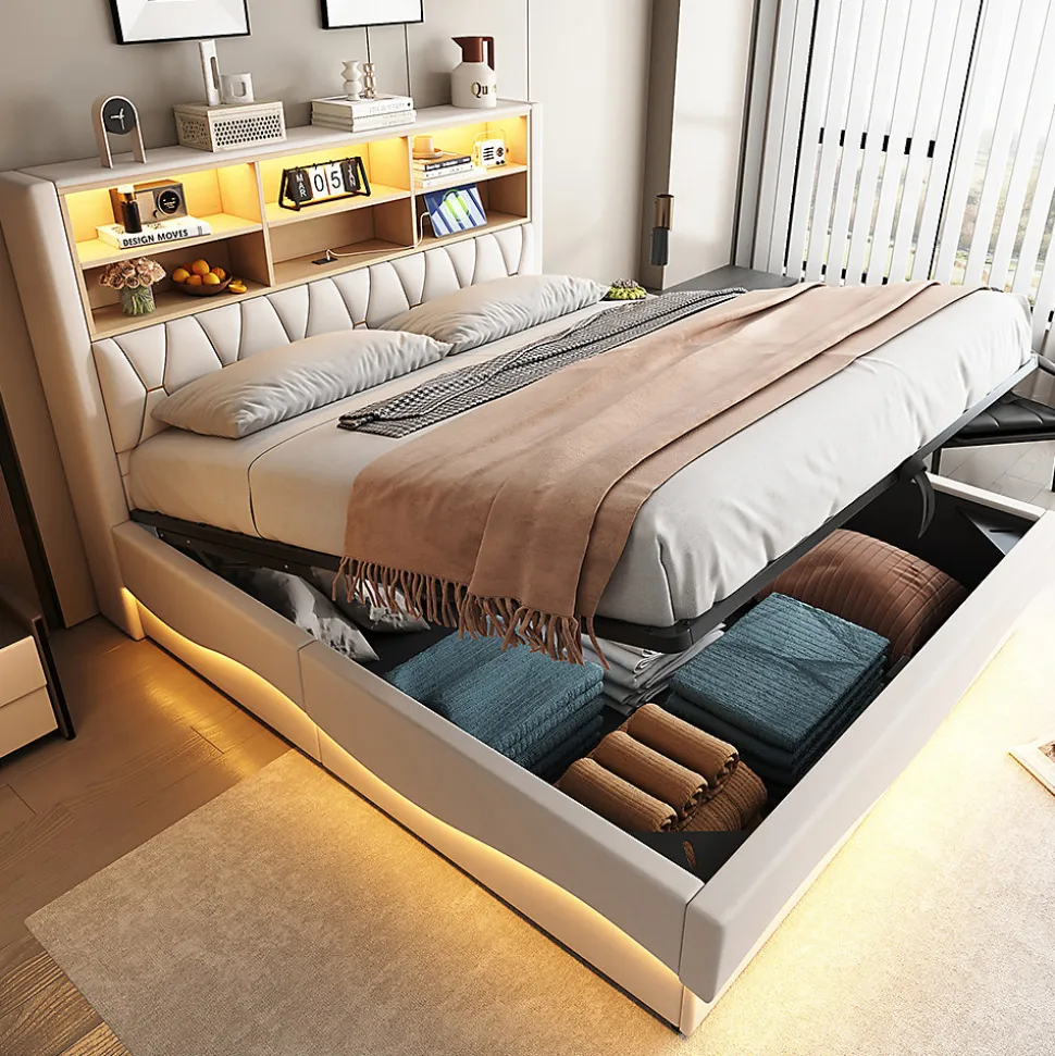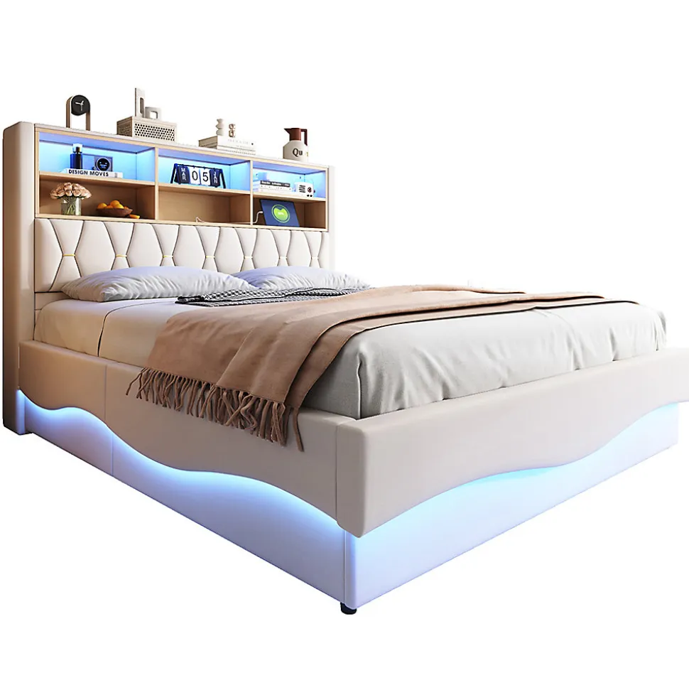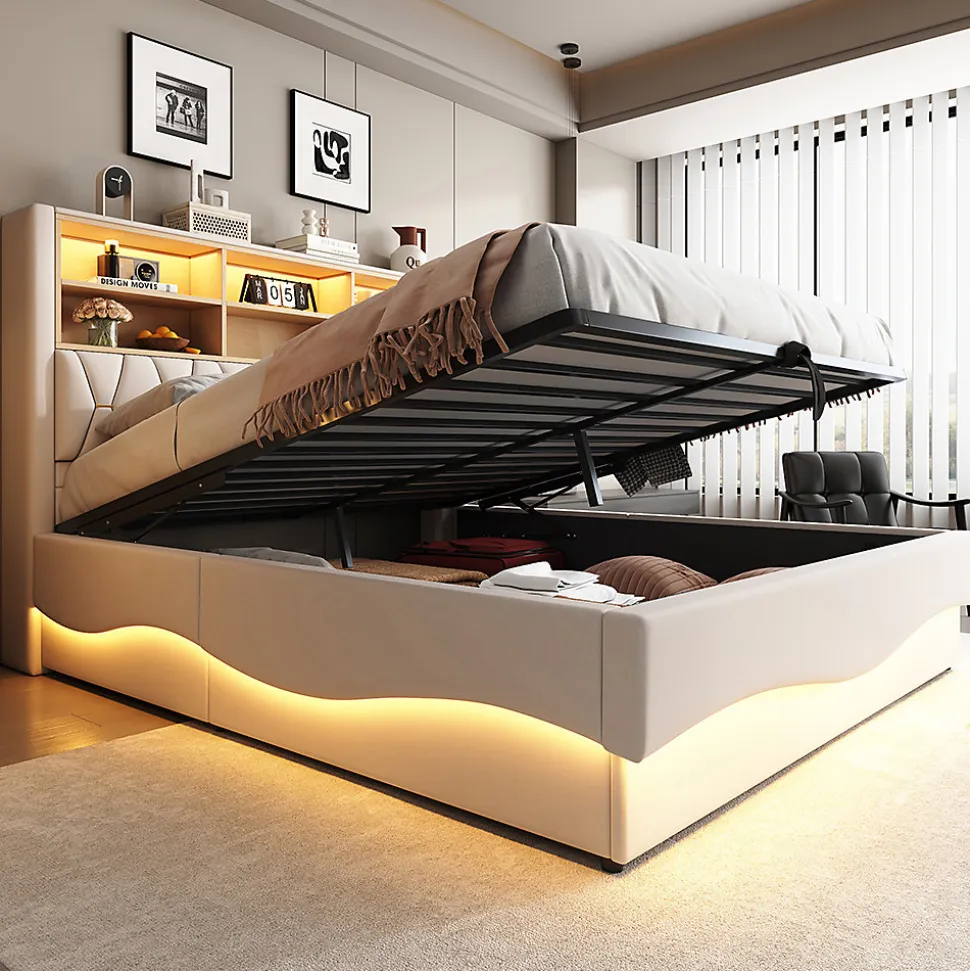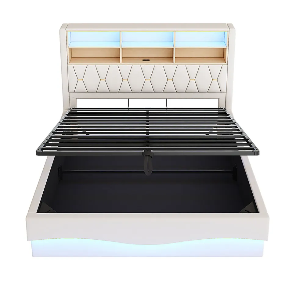 SpécificationsCouleur principale : BeigeMatériau principal : FerDimensionsLongueur assemblé (cm) : 221,00Largeur assemblé (cm) : 183,00Hauteur assemblé (cm) : 131,00Poids du produit (kg) : 62,00Dimensions du colisSous-article 1 :134,16 * 37,9 * 9,45 cm 16,02 kgSous-article 2 : 186.13 * 29.62 * 21.64 cm 30.36 kgSous-article 3 : 181.81 * 37.06 * 10.46 cm 23.56 kgCaractéristiques du produitÉclairage LED intelligent : bande lumineuse LED intégrée contrôlable via une application pour smartphone ou une télécommande. L’ambiance multicolore et la lumière de lecture chaude créent une atmosphère apaisante pour s’endormir.IDÉE DE RANGEMENT SCIENTIFIQUE : le lit est équipé d’un compartiment de rangement ouvert pour les livres, les jouets ou la literie afin d’optimiser l’espace. Le lit est équipé d’un dispositif de levage hydraulique qui permet d’ouvrir facilement le vaste espace de rangement sous le lit, idéal pour ranger la literie, les jouets ou les vêtements de saison.Structure métallique robuste : le sommier à lattes renforcé en métal offre une grande stabilité et une capacité de charge pour une sécurité durable.Housse en lin douce pour la peau : rembourrage complet du lit + lin respirant, coins arrondis sans bords durs, résistant aux chocs, facile d’entretien pour les activités quotidiennes.INTERFACE DE CHARGE USB : la table de chevet est équipée d’une prise USB qui permet de recharger facilement les téléphones portables, les lampes de bureau et autres appareils pendant la nuit.