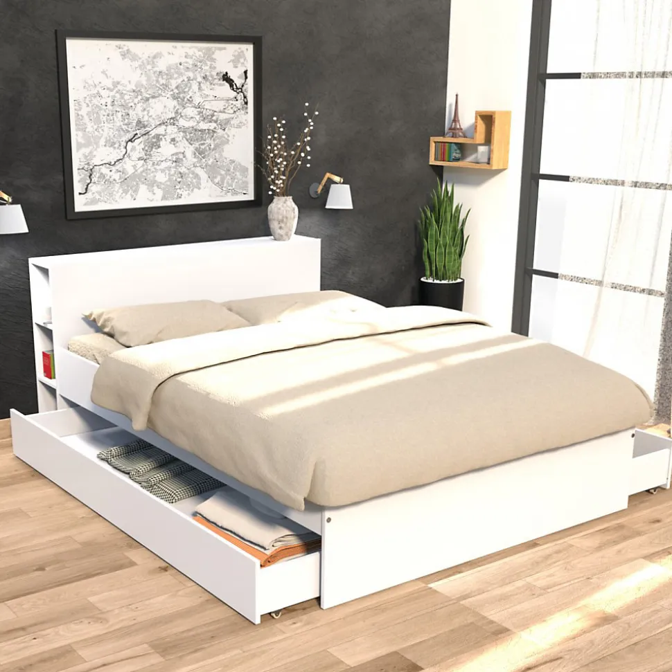 Lit 2 places 140x190cm Blanc ROGO inclus sommier et tete de lit avec étageres et 2 tiroirs