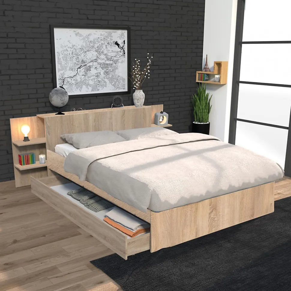 Lit 2 places 140x190cm Chêne CITA inclus sommier et tete de lit chevet et tiroir