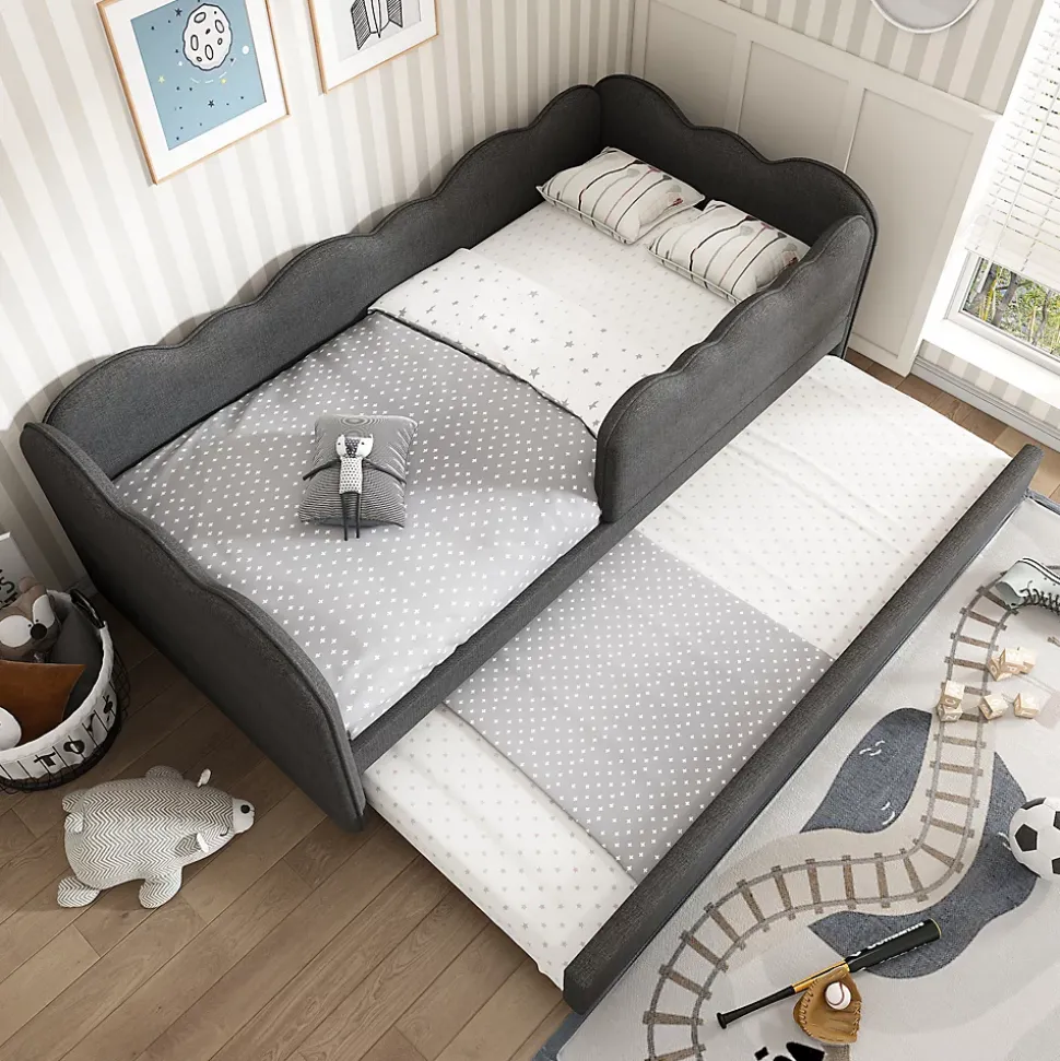 Design & styleCe lit 90×190 cm présente une silhouette douce en forme de nuage et un dossier rembourré pour un confort d’assise. Le revêtement en lin gris apporte une finition sobre et chaleureuse, idéale pour une chambre d’enfant ou une petite chambre d’ami. Les bords arrondis et la forme ergonomique réduisent les angles vifs pour limiter les risques de blessure.Fonctionnalité & rangement Lit principal et lit gigogne compatibles avec matelas 90×190 cm (matelas non fournis) ; la gigogne accepte de préférence une épaisseur de matelas inférieure à 13 cm pour un rangement optimal. Le châssis métallique du lit gigogne offre une assise stable et sûre, équipé de 6 roulettes avec frein pour la sécurité et de deux barres en U empêchant le déplacement du matelas pendant l’utilisation. Cadre en L avec côtés interchangeables et barrière avant amovible, permettant d’adapter la configuration selon l’âge de l’enfant ou l’aménagement de la pièce.Matériaux & entretienStructure composée d’éléments en panneaux et d’un cadre métallique pour la partie gigogne, rembourrage en mousse épaisse au dossier et tissu lin gris en finition. Charge maximale recommandée 150 kg. Surface facile à entretenir : dépoussiérage ou nettoyage local avec un chiffon légèrement humide, éviter les produits agressifs.Installation & emballageMontage requis, deux personnes conseillées. Produit livré en 2 colis (dimensions extérieures 99 x 197 x 70 cm une fois assemblé) ; les pièces sont numérotées et un outil simple ainsi qu’une notice sont fournis pour faciliter l’assemblage. Le lit ne nécessite pas de boxspring et est expédié en plusieurs colis pouvant arriver séparément. En cas de pièces manquantes, merci de contacter le service client.