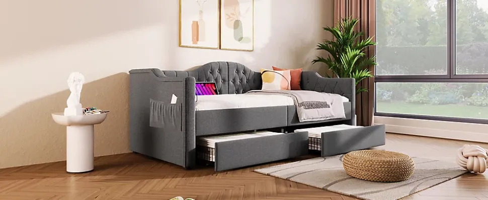 Design & styleCe lit 90×190 cm associe une tête de lit capitonnée au charme vintage et des accoudoirs aux formes douces, le tout tapissé d’un lin gris sobre. Sa silhouette étudiée apporte une présence discrète et chaleureuse qui s’intègre facilement aux décors contemporains ou scandinaves. Dimensions totales : 99x205x86,5 cm (LxlxH).Fonctionnalité & rangement Deux tiroirs intégrés sous le couchage pour organiser draps, couettes, vêtements et jouets. Deux poches latérales pratiques pour télécommande, téléphone et magazines afin de garder les essentiels à portée de main. Ports de charge intégrés (USB et USB‑C) situés près de l’accoudoir pour alimenter appareils sans rechercher une prise murale.Matériaux & entretienStructure combinant acier, bois massif et panneaux MDF pour une stabilité adaptée à un usage quotidien. Accoudoirs et dossier garnis de mousse haute densité recouverts de tissu lin gris pour un confort soutenu. Charge maximale recommandée : 158 kg (350 lb). Entretien facile : surfaces textiles à dépoussiérer et taches ponctuelles à nettoyer avec un chiffon humide doux.Installation & emballageMontage requis, deux personnes conseillées pour un assemblage sûr. Produit livré en 2 colis pouvant arriver séparément. Poids brut/net : 49,5/42,7 kg. Contenu du colis : châssis de lit avec tiroirs, ports USB/Type‑C et accessoires de montage. Notice de montage fournie et disponible en ligne.