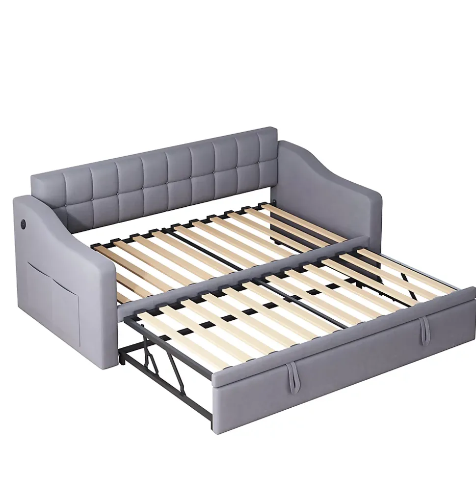 Design & styleCe lit convertible 2 en 1 associe un revêtement en velours gris et des lignes modernes pour une intégration discrète dans le salon, la chambre d’amis ou un studio. Le tissu velours apporte une sensation douce et une finition soignée, tout en conservant une silhouette sobre adaptée aux intérieurs contemporains.Fonctionnalité & confortLe canapé-lit est conçu pour optimiser l’espace : couchage principal 90×190 cm et mécanisme d’extension permettant d’obtenir une surface de couchage jusqu’à 180 cm. Transformation rapide du sofa au lit, idéale pour accueillir un invité ponctuel. Les accoudoirs sont équipés de ports USB des deux côtés pour recharger téléphone et tablette sans déplacer le mobilier.Structure & stabilité Cadre renforcé combinant métal, contreplaqué et MDF pour une base stable. 24 lattes assurant une bonne répartition du poids et une tenue durable. Capacité de charge recommandée jusqu’à 300 kg, adaptée à un usage domestique courant.Matériaux & entretienRevêtement : tissu velours doux au toucher. Structure : métal, contreplaqué et panneaux MDF. Pour l’entretien, utiliser un chiffon doux ou une brosse douce ; éviter les produits abrasifs ou l’immersion. Un entretien régulier prolonge l’aspect du velours et limite l’accumulation de poussière.Dimensions & emballageDimensions globales : 207x99x80 cm. Couchage principal : 90×190 cm ; couchage extensible jusqu’à 180×190 cm lorsqu’il est déployé. Poids produit : environ 40 kg ; livré en 2 colis (poids total colis ≈ 45 kg). Épaisseur de matelas recommandée : 8–12 cm pour le couchage 90×190 cm et 8–10 cm pour la partie extensible.Installation & livraisonMontage complet requis, estimé à environ 1 heure pour deux personnes. Outils de base inclus (tournevis nécessaire), éviter l’utilisation d’outils électriques pendant l’assemblage. Produit livré en plusieurs colis pouvant arriver séparément ; prévoir de l’espace pour l’installation et lire attentivement la notice fournie.