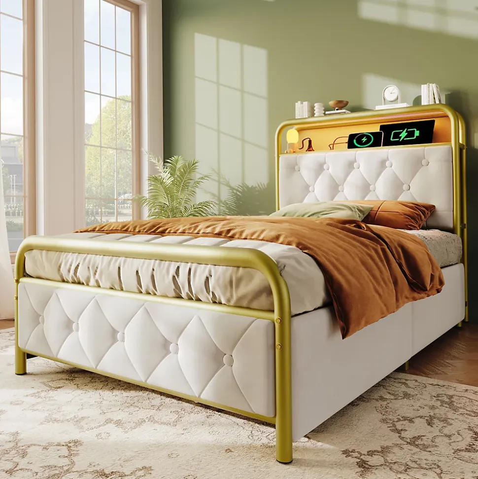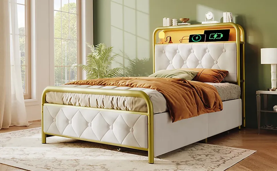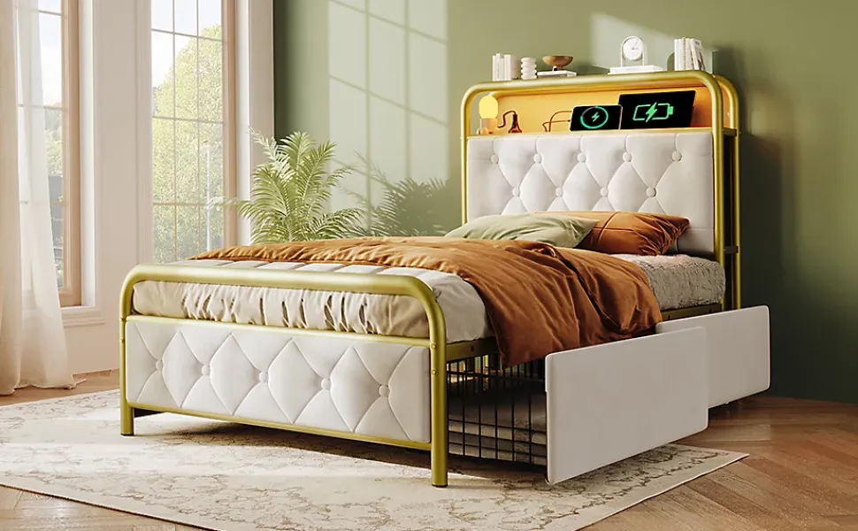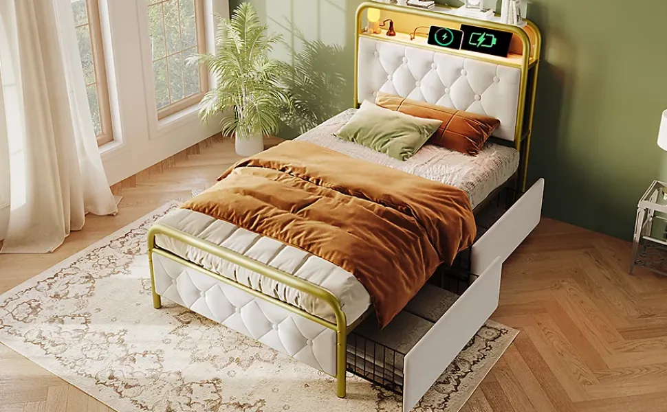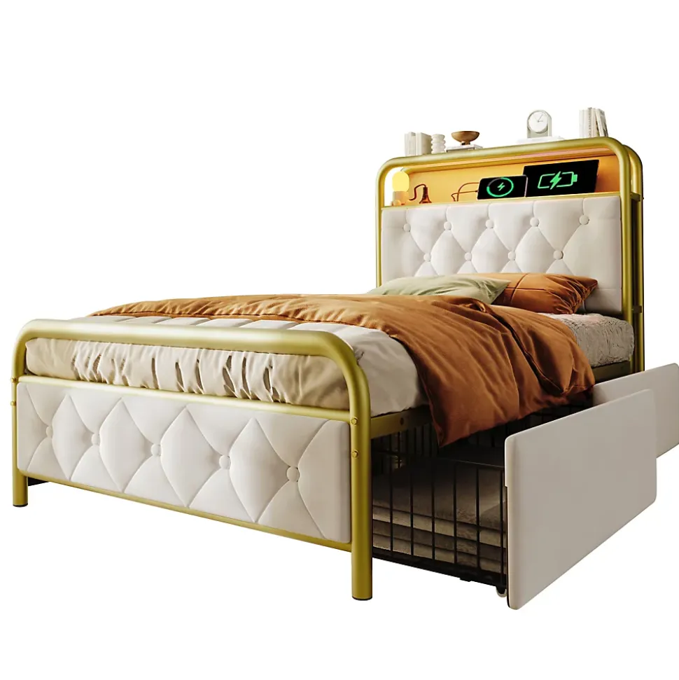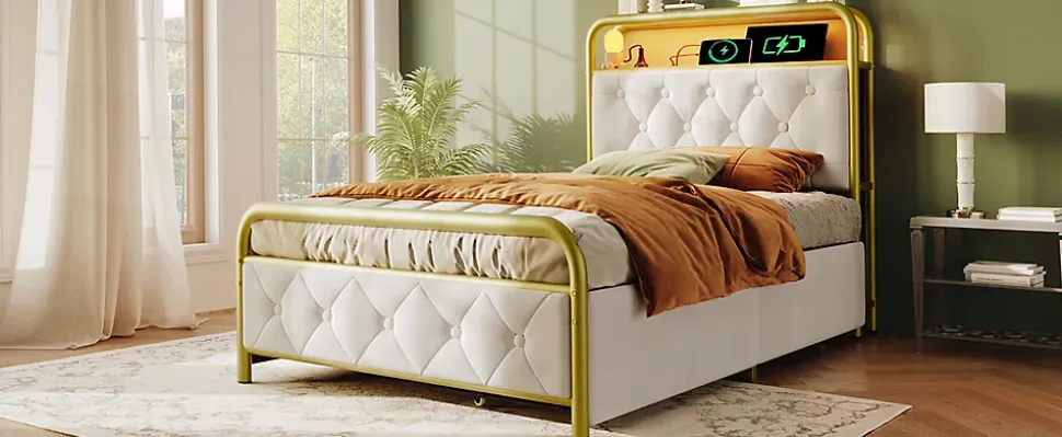 Design & styleCe lit 90×200 cm associe un revêtement en velours blanc à une tête de lit capitonnée pour un rendu à la fois élégant et discret. Les proportions étudiées (dimensions totales 94x223x106 cm) permettent une intégration facile dans différents décors contemporains ou naturels, sans surcharger l’espace.Fonctionnalité & rangement Deux tiroirs de rangement amovibles sous le couchage (dimensions intérieures 63x39x16,5 cm) pour linge de lit, vêtements et accessoires hors saison. Tête de lit équipée d’une étagère double, idéale pour lampe, téléphone ou livre à portée de main avant de dormir. Pratique au quotidien : coffre accessible sans effort et tiroirs faciles à extraire pour optimiser l’espace de la chambre.Matériaux & entretienStructure en acier laqué résistant, colonnes de support Ø3 cm et pieds renforcés garantissant une tenue stable ; revêtement en velours respirant sur la tête et le cadre. Finitions lisses, nettoyage recommandé avec un chiffon doux et sec ou légèrement humide sans produits abrasifs.Connectique & éclairageTête de lit intégrant une multiprise avec 1 port Type-C, 1 port USB-A et 2 prises secteur pour recharger vos appareils depuis le lit. Éclairage LED RGB intégré proposant 16 couleurs, réglage de la luminosité, fonctions timer et mode musique ; contrôle possible via boutons, télécommande ou application mobile pour adapter l’ambiance selon l’usage.Installation & emballageMontage requis, notice fournie et recommandé pour deux personnes. Produit livré en 2 colis (contenu : cadre de lit + 2 tiroirs). Poids brut : 36,35 kg ; poids net : 31,2 kg. Capacité d’utilisation indiquée jusqu’à 240 kg. Matelas non fourni. Les colis peuvent arriver séparément afin de réduire les risques de dommages pendant le transport.