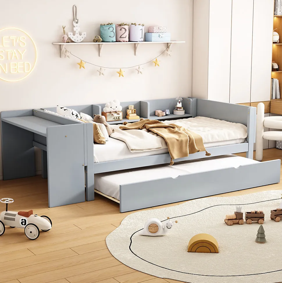 Design & styleCe lit 90×200 cm associe un style moderne et des lignes pensées pour l’univers enfant : finition gris neutre, structure apparente en pin massif et faces en MDF pour un aspect soigné et chaleureux. La hauteur totale de 73 cm et les proportions sont étudiées pour s’intégrer facilement dans une chambre d’enfant tout en apportant une silhouette contemporaine et douce.Fonctionnalité & rangement Lit gigogne escamotable pour accueillir un couchage supplémentaire : intérieur du tiroir 90 x 180 cm, capacité 80 kg, recommandé pour une épaisseur de matelas de 10 cm. Bureau intégré et amovible pouvant être positionné à la tête ou au pied du lit pour créer un coin travail ou lecture pratique et gain de place. Trois étagères latérales pour ranger livres, jouets et accessoires et favoriser l’ordre dans la chambre.Matériaux & entretienStructure en pin massif combinée à des éléments en MDF pour une bonne résistance et une surface lisse. Nombre de lattes : 8. Capacité maximale du couchage principal : 140 kg. Recommandation d’épaisseur de matelas pour le couchage principal : 15–20 cm. Pour l’entretien, utiliser un chiffon doux et sec ou légèrement humide ; éviter les produits abrasifs ou corrosifs afin de préserver les finitions.Installation & emballageProduit fabriqué au Vietnam, livré depuis l’Europe en 2 colis (les colis peuvent arriver séparément). Montage requis, deux personnes recommandées pour assurer la stabilité et la sécurité de l’assemblage. Le mobilier est conçu pour un usage quotidien et pour optimiser l’espace dans une chambre d’enfant.