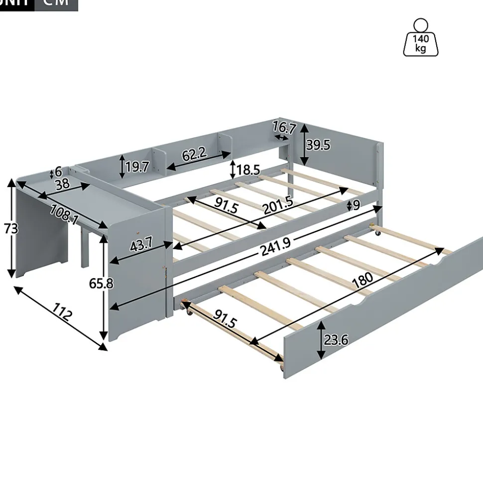 - Structure robuste en pin massif et MDF, charge utile 140 kg. Lit gigogne extensible (intérieur 90×180 cm, capacité 80 kg). Trois étagères latérales et bureau modulable pour un rangement optimisé.