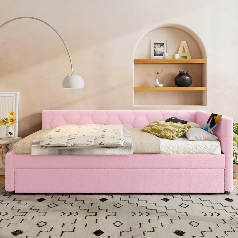 Design & styleCe lit 90×200 cm associe un revêtement en velours doux à un motif géométrique discret pour créer un nid chaleureux et moderne dans la chambre d’un enfant. Les lignes épurées et la finition MDF apportent une esthétique sobre et harmonieuse, facile à intégrer dans différents décors.Fonctionnalité & rangementConçu comme un daybed multifonctionnel, il se transforme en un geste grâce à son lit gigogne coulissant, offrant un couchage supplémentaire sans encombrer l’espace. Le lit intègre également une lampe de chevet diffusant une lumière chaude, ainsi que des ports USB et Type‑C pour recharger tablettes et appareils électroniques en toute simplicité.Matériaux & confortRevêtement en velours (vliesimitat) agréable au toucher, structure en MDF pour une tenue stable. Intérieur du lit : 90 x 200 cm. Recommandation d’épaisseur de matelas pour le lit principal : 10–15 cm. Le sommier et la conception garantissent un confort quotidien adapté aux besoins des enfants.Caractéristiques techniques Dimensions extérieures approximatives : 208 x 95 x 66,5 cm Dimensions intérieures du couchage : 90 x 200 cm Lit gigogne intérieur : 89,5 x 188 cm, capacité 80 kg, matelas recommandé 10 cm Capacité du lit principal : 150 kgInstallation & emballageMontage requis, deux personnes conseillées. Produit livré en 2 colis qui peuvent arriver séparément ; prévoir de la patience lors de la réception. Entretien simple : dépoussiérer et nettoyer le velours avec un chiffon doux, éviter les produits agressifs.
