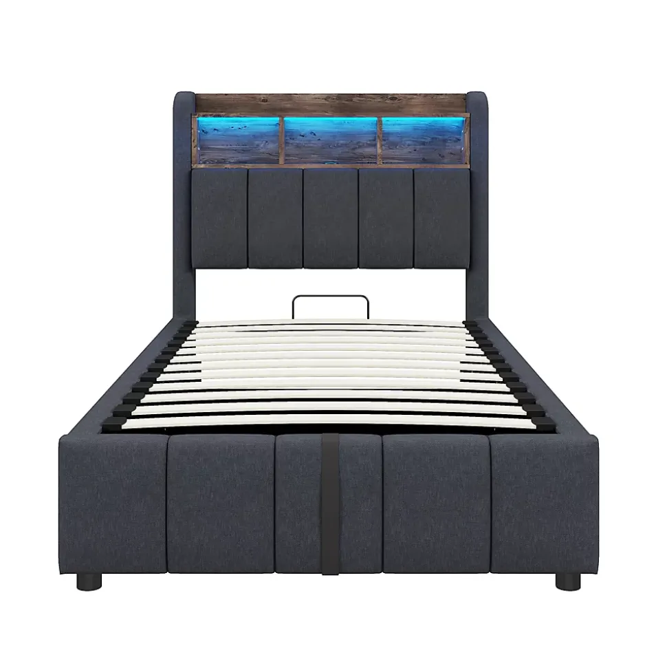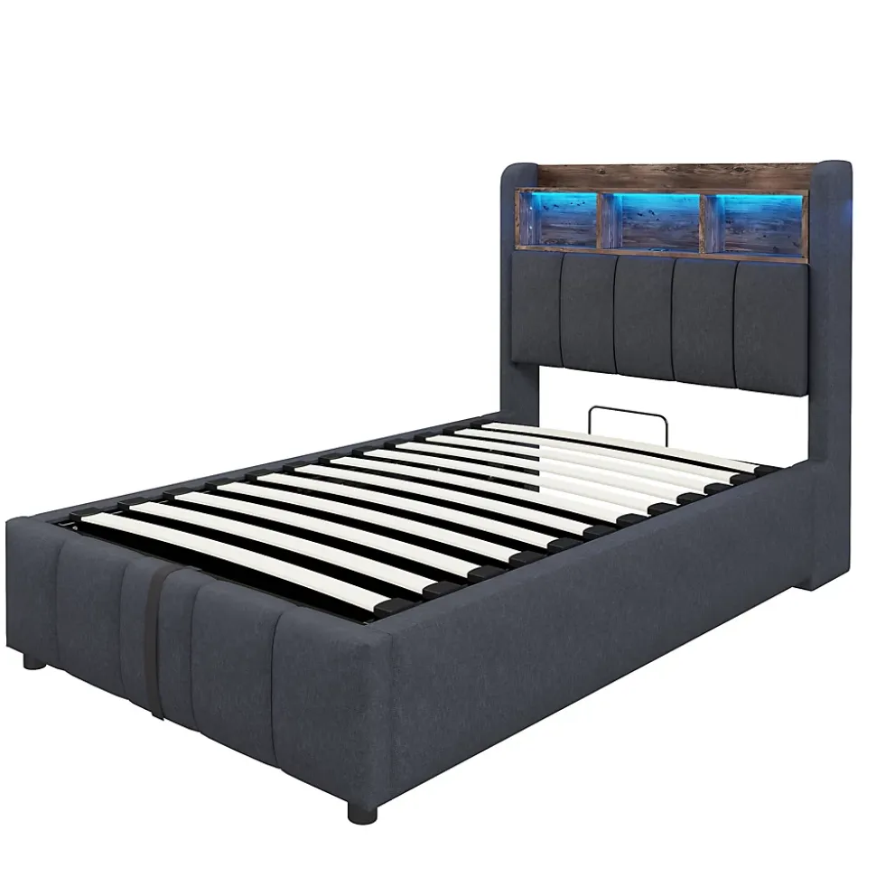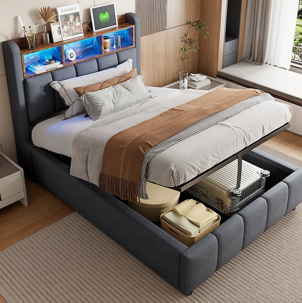Design & style Ce lit associe lignes épurées et finitions soignées : revêtement en tissu lin gris résistant, tête de lit avec étagères pratiques et éclairage led multicolore intégrable pour adapter l’ambiance selon vos envies.Fonctionnalité & rangement Le mécanisme hydraulique soulève facilement le sommier pour accéder à un grand espace de rangement sous le lit, idéal pour couettes, oreillers et vêtements. Le rangement de tête de lit permet d’organiser livres et appareils, tandis que les ports usb et type‑c facilitent la recharge au chevet.Matériaux & solidité Structure solide avec cadre métal et renforts en contreplaqué/mdf, 24 lattes pour un soutien homogène. Les larges pieds latéraux améliorent la stabilité et la durabilité ; tissu lin traité pour résister à l’usure et aux taches au quotidien.Confort & entretien Conçu pour recevoir un matelas 90×200 cm d’une épaisseur recommandée de 24–26 cm. Surface agréable au toucher, entretien facile avec un chiffon doux et des produits non abrasifs afin de préserver l’aspect du revêtement.Installation & livraison Montage complet requis, deux personnes recommandées, temps estimé environ 2 heures. Outils inclus (tournevis), évitez l’usage d’outils électriques. Dimensions totales : 215x90x111 cm. Poids produit : 34 kg, poids colis total : 39 kg, capacité de charge : 200 kg, livré en 2 colis.