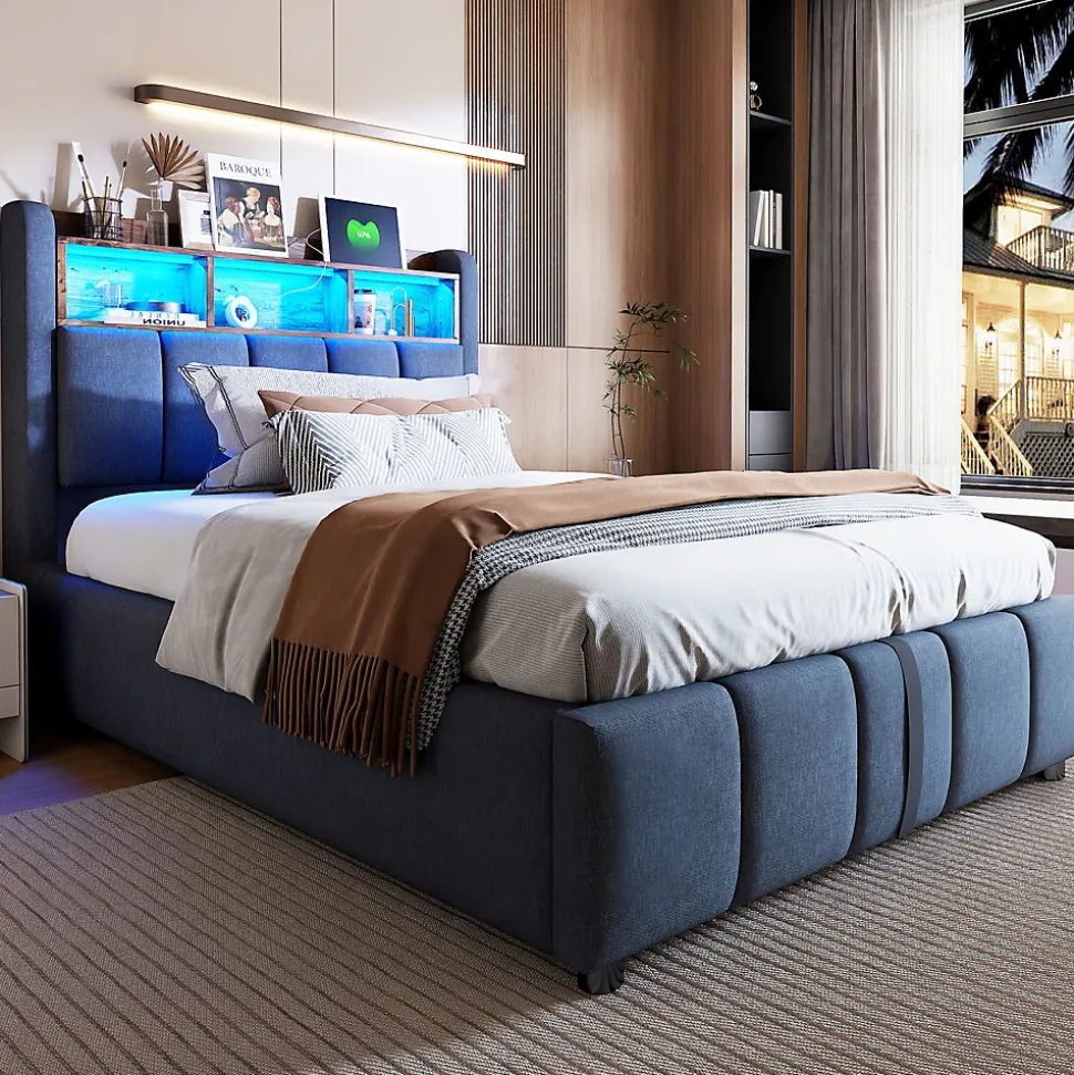 - Design moderne et élégant, tapissé en tissu lin gris résistant aux taches et à l’usure ; tête de lit avec étagères intégrées et éclairage led changeant pour une ambiance personnalisée.