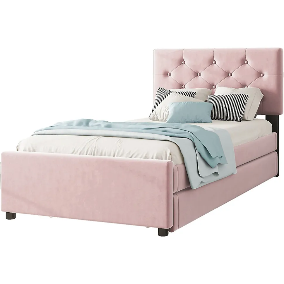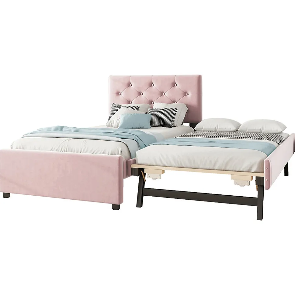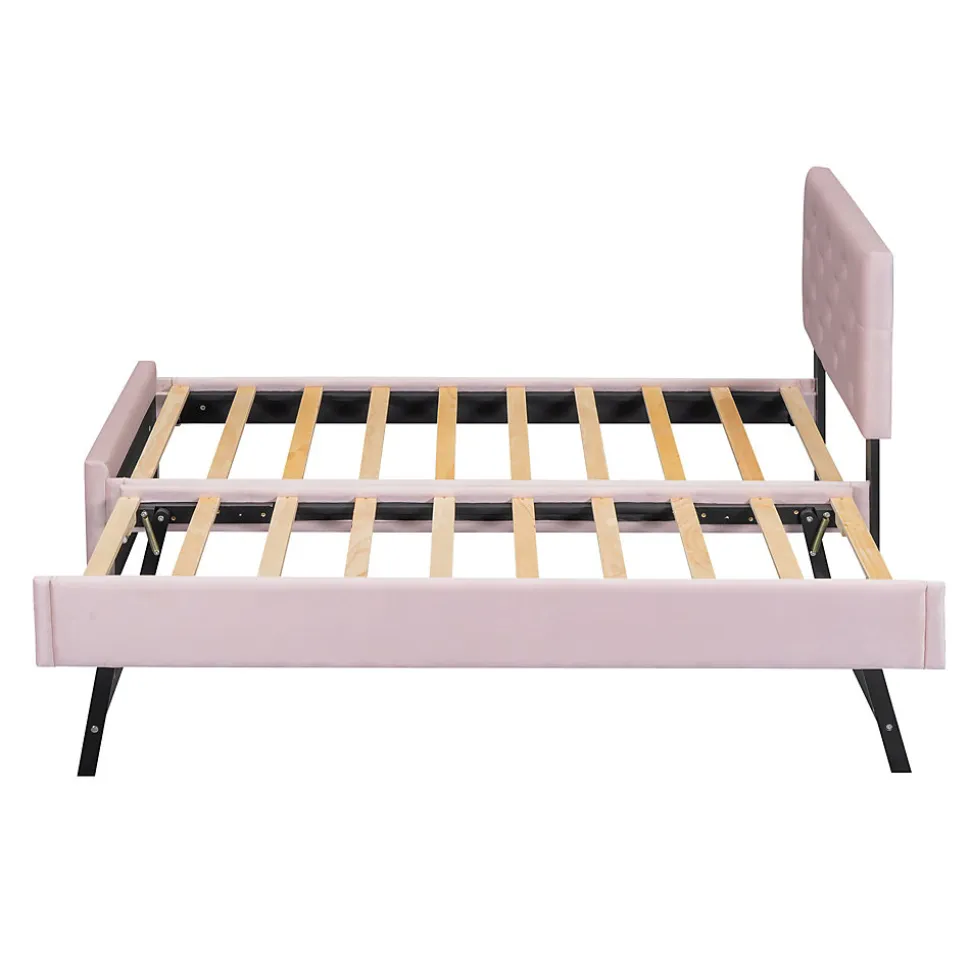 Design & styleCe lit tapissé en velours rose associe douceur et élégance pour une chambre accueillante. La tête de lit capitonnée avec boutons apporte un détail raffiné et romantique, tandis que la silhouette aux lignes sobres s’intègre dans un intérieur moderne ou enfantin.Fonctionnalité & rangement Tiroir roulant multifonction, positionnable à gauche ou à droite selon l’agencement de la chambre ; possibilité d’ajuster le tiroir à la même hauteur que le lit principal pour étendre la surface de couchage. Sommier à lattes (20 lattes) inclus, intérieur du couchage 90 x 200 cm. Tiroir intérieur : 90 x 190 cm. Capacité de charge : lit principal 150 kg, tiroir roulant 100 kg. Recommandation d’épaisseur de matelas : 10–15 cm pour le lit principal, 10 cm pour le lit roulant (matelas non fourni).Matériaux & entretienStructure en panneaux MDF et revêtement en velours (flanelle) pour une bonne tenue et une apparence chaleureuse. Finitions soignées qui soulignent l’esthétique. Entretien facile : nettoyage avec un chiffon doux et sec ou légèrement humide selon les taches.Installation & livraisonMontage requis, 2 personnes recommandées ; kit et notice fournis pour un assemblage guidé. Produit livré en 2 colis pouvant arriver séparément. Dimensions approximatives du produit assemblé : 209 x 105 x 104 cm. Fabrication d’origine Vietnam. Veuillez noter de légères variations dimensionnelles (±2–3 cm) et possibles différences de teinte selon l’éclairage.
