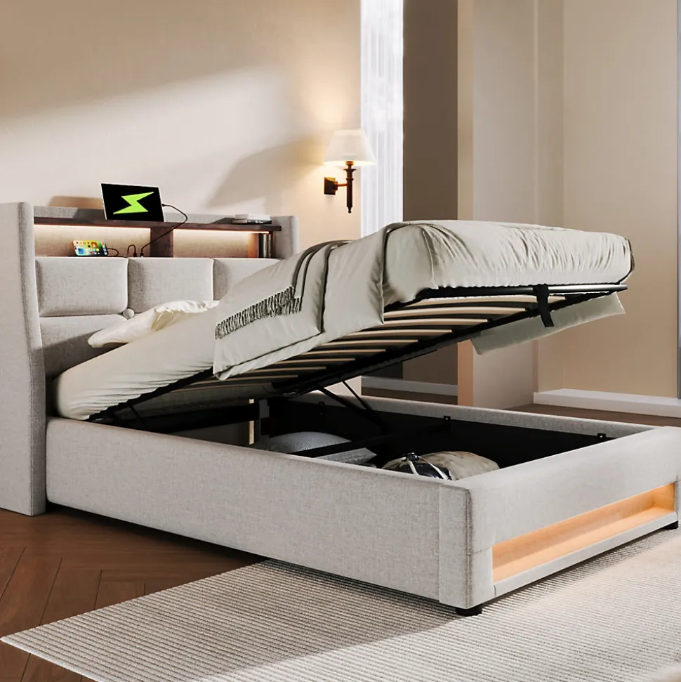 - Design vintage-moderne en tissu lin beige avec panneaux imitation bois et tête capitonnée rembourrée en mousse haute densité; éclairage LED multicolore discret pour une ambiance personnalisable.