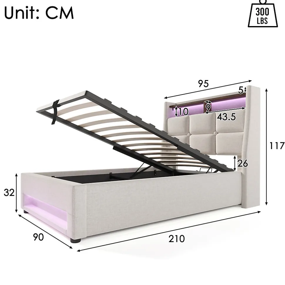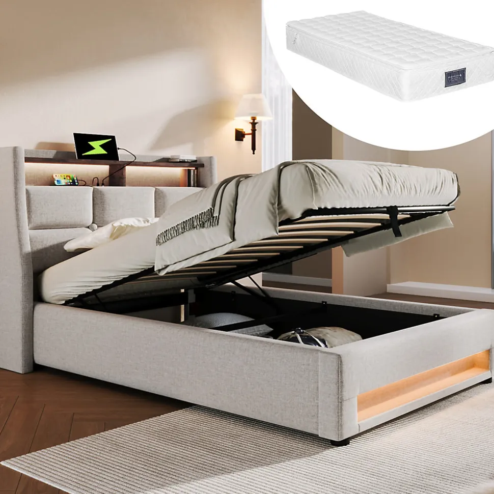 Design & styleCe lit 90×200 cm présente un style vintage-moderne associant revêtement en lin beige et panneaux à motif bois. La tête capitonnée rembourrée en mousse haute densité offre un appui confortable pour la lecture ou la détente, tandis que l’éclairage LED multicolore intégré crée une atmosphère modulable selon vos envies.Fonctionnalité & rangement Sommier à lattes offrant un soutien stable et une bonne ventilation de la literie. Coffre de rangement relevable assisté par vérin gaz pour accéder facilement à l’espace sous le sommier et ranger couettes ou valises. Étagère intégrée et prise USB au niveau de la tête pour poser et recharger téléphone ou tablette; butoirs empêchent le déplacement de la matelas.Matériaux & confortRevêtement en tissu lin testé Oeko‑Tex pour limiter les risques d’allergie, mousse haute densité dans la tête de lit et structure combinant bois massif et éléments métalliques pour une bonne durabilité. Fond en non-tissé sous le lit pour limiter la poussière.Matelas compatibleConçu pour accueillir une matelas 90×200 cm (non fournie). Le cadre accepte des matelas de fermeté moyenne à ferme (ex. H3) et supporte un poids utilisateur maximal recommandé de 150 kg. Le sommier optimise la ventilation et convient à différentes positions de sommeil.Installation & livraisonMontage requis, deux personnes recommandées. Dimensions totales 95x210x117 cm (LxPxH). Produit livré en plusieurs colis (3 colis), poids brut/net indicatif fourni dans la fiche technique; la télécommande pour LED et la prise USB sont incluses. Entretien simple : dépoussiérer et nettoyer avec un chiffon doux.