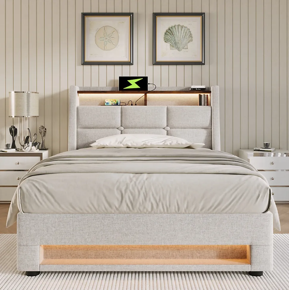 - Design vintage contemporain en lin beige avec panneaux effet bois et éclairage LED multicolore en tête et pied; tête de lit matelassée rembourrée en mousse haute densité pour un appui confortable.