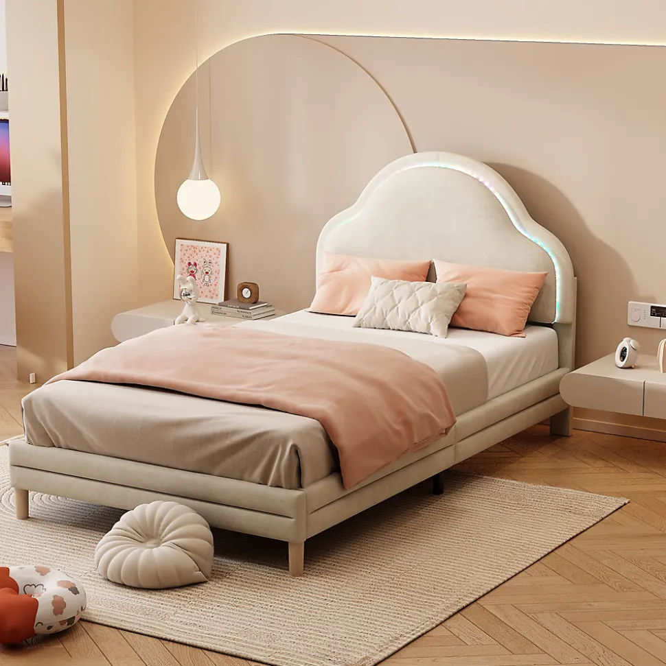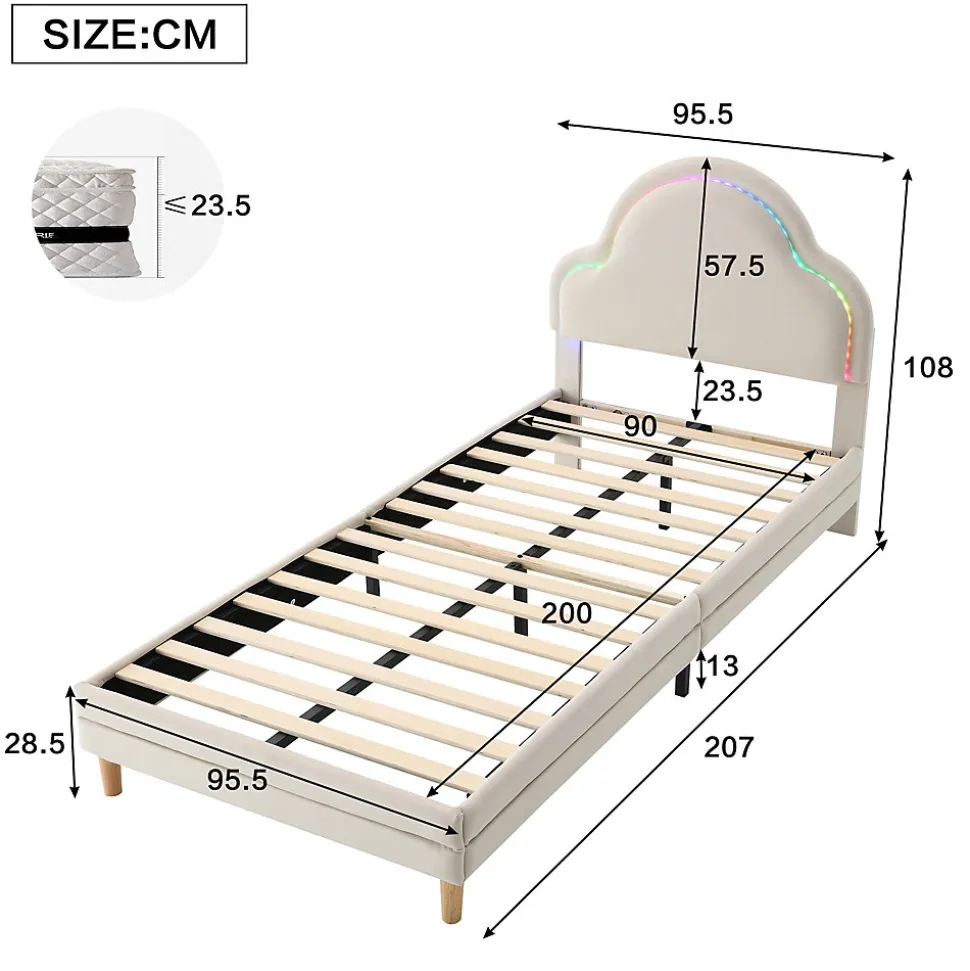 Design & styleCe lit associe un design ludique et une finition soignée : tête de lit en forme de nuage rembourrée et revêtement en velours beige apportent douceur et caractère à la chambre. Les bandes led multicolores intégrées offrent des centaines de modes et des effets lumineux changeants pour créer une atmosphère magique et stimulante pour les enfants.Fonctionnalité & soutien Cadre conçu pour matelas 90×200 cm (matelas non inclus) avec épaisseur recommandée ≤23,5 cm. Quatorze lattes en bois répartissent le poids pour un soutien homogène et un sommeil réparateur. Capacité de charge jusqu’à 136 kg, adaptée à un usage quotidien en chambre enfant.Matériaux & entretienRevêtement en velours agréable au toucher et facile à intégrer dans différents styles. Structure légère et stable, poids total approximatif 20 kg. Pour l’entretien, utiliser un chiffon en coton ou une brosse douce pour retirer poussière et saletés ; éviter brosses dures et produits abrasifs. En cas de liquide, tamponner immédiatement avec un tissu absorbant.Installation & emballageMontage requis avec notice détaillée et pièces complètes fournies. Deux personnes sont recommandées pour l’assemblage. Dimensions totales : 207×95,5×108 cm. Produit livré en 1 colis, origine Chine. Les couleurs peuvent varier légèrement selon l’éclairage.