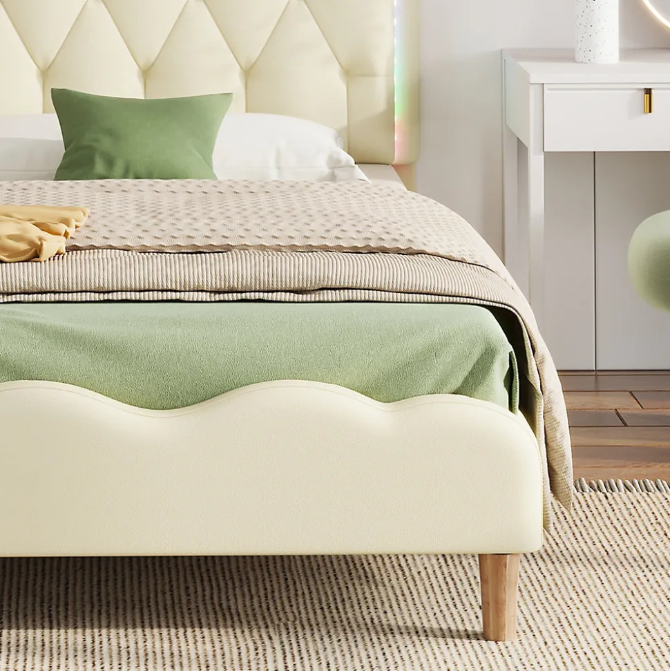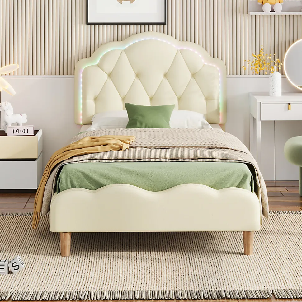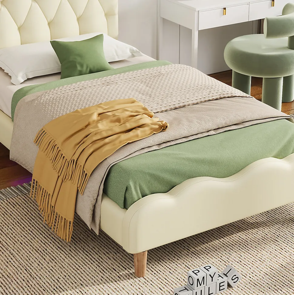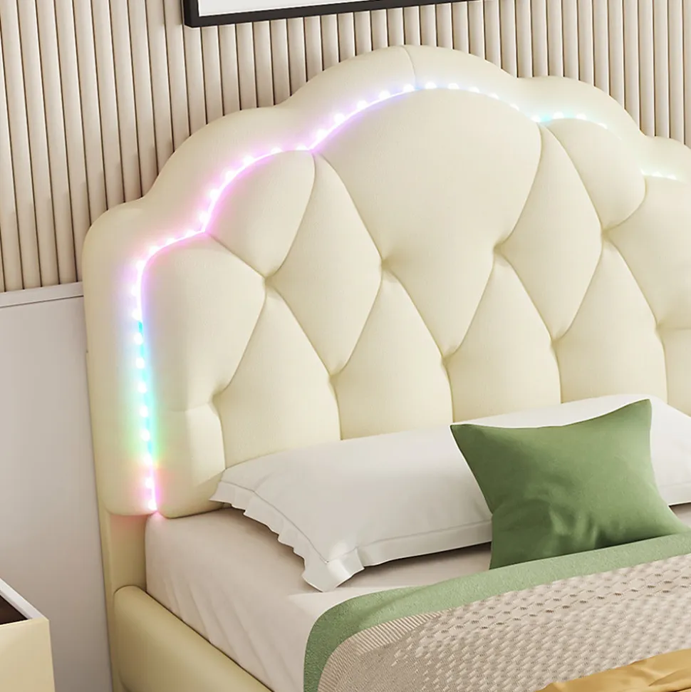 - Design élégant en PU beige avec une tête de lit ondulée et une bande LED multicolore intégrée : ambiance ludique et adaptée aux chambres d’enfant, sobre et harmonieuse.