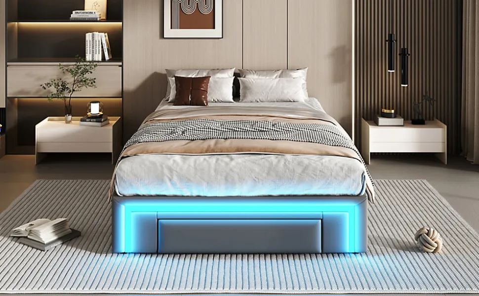 Design & styleCe lit 90×200 cm combine un design moderne et discret, habillé d’un revêtement en PU‑cuir gris pour une allure élégante et contemporaine. L’absence de tête de lit offre la liberté de personnaliser l’ensemble avec un élément adapté à votre intérieur, du plus minimaliste au plus chaleureux.Fonctionnalité & rangement Plusieurs tiroirs intégrés sous le couchage pour optimiser l’espace et ranger linge, couettes ou accessoires de saison. Solution pratique pour les petites chambres ou pour ceux qui cherchent à réduire l’encombrement sans compromettre le confort. Conception qui facilite l’accès au rangement tout en gardant un look épuré.Matériaux & entretienStructure composée d’un cadre métallique et d’un système de lattes robustes, associée à une garniture en PU‑cuir résistante. Capacité de charge jusqu’à 200 kg. Finitions lisses faciles à entretenir : essuyer avec un chiffon doux et éviter les produits abrasifs ou les solvants.Éclairage & expérienceBande LED RGB intégrée au pied de lit, réglable par télécommande pour ajuster la couleur et l’intensité selon l’ambiance souhaitée, utile pour la lecture ou pour créer une atmosphère détendue le soir.Installation & emballageMontage complet requis, estimé à environ 1 heure avec deux personnes. Le produit est livré en 1 colis. Outils courants fournis, évitez l’usage d’outils électriques puissants. Vérifiez les dimensions (200 x 90 x 32 cm) et l’épaisseur de matelas recommandée (22–25 cm) avant installation.Usage & compatibilitéAdapté à un style moderne, industriel ou minimaliste, ce lit tapissé offre une base stable et fonctionnelle pour aménager une chambre avec confort et rangement intégré, sans nécessiter de sommier supplémentaire.