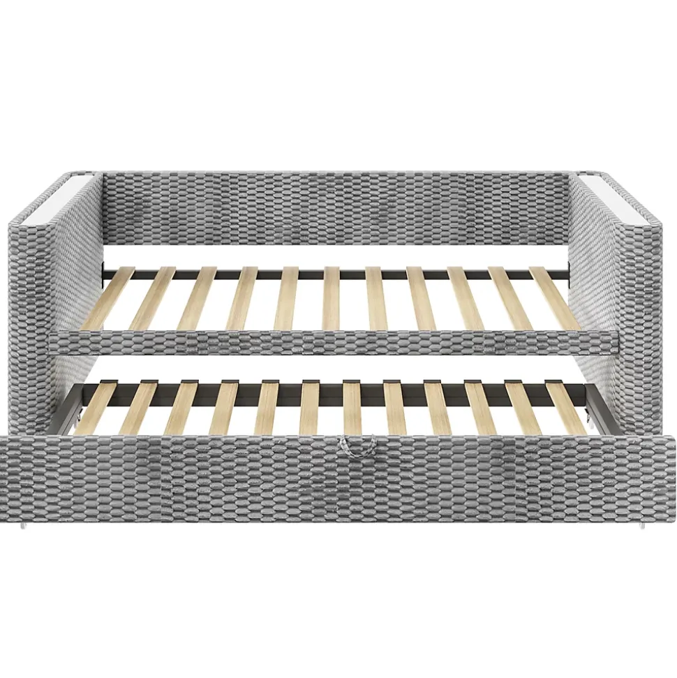 Design & styleCe lit combine un revêtement en velours gris et une structure en MDF pour offrir une sensation de confort et une esthétique raffinée. Les lignes épurées et les finitions soignées s’intègrent facilement dans un intérieur contemporain, chambre d’amis ou chambre d’enfant.Fonctionnalité & couchage Solution 2-en-1 : couchage principal 90×200 cm pouvant se convertir rapidement en un lit double 180×200 cm, idéal pour optimiser les petits espaces. Mécanisme d’extension manuel conçu pour une utilisation simple et sécurisée, adapté aux adultes comme aux enfants. Bonnets de charge et recommandations : capacité jusqu’à 150 kg et épaisseur de matelas recommandée 10 cm (matelas non inclus).Matériaux & entretienRevêtement en velours doux et structure en panneaux MDF pour un bon compromis entre tenue et confort. Pour l’entretien, dépoussiérer régulièrement et nettoyer avec un chiffon doux ; éviter les produits agressifs pour préserver la couleur et la texture du tissu.Dimensions & informations techniquesDimensions principales du produit assemblé : environ 229 x 191 x 68 cm. Dimensions du couchage : 90×200 cm (usage standard) et 180×200 cm une fois déployé. Intérieur du couchage extensible environ 90×190–200 cm selon position. Poids supporté : 150 kg.Installation & emballageMontage requis, deux personnes recommandées. Le produit est expédié en 3 colis qui peuvent arriver séparément ; prévoir un espace suffisant pour l’assemblage. Attention aux tolérances de mesure de l’ordre de 2–3 cm et variations de teinte possibles selon l’éclairage. Origine : Chine. En cas de question lors du montage, se référer au manuel fourni.