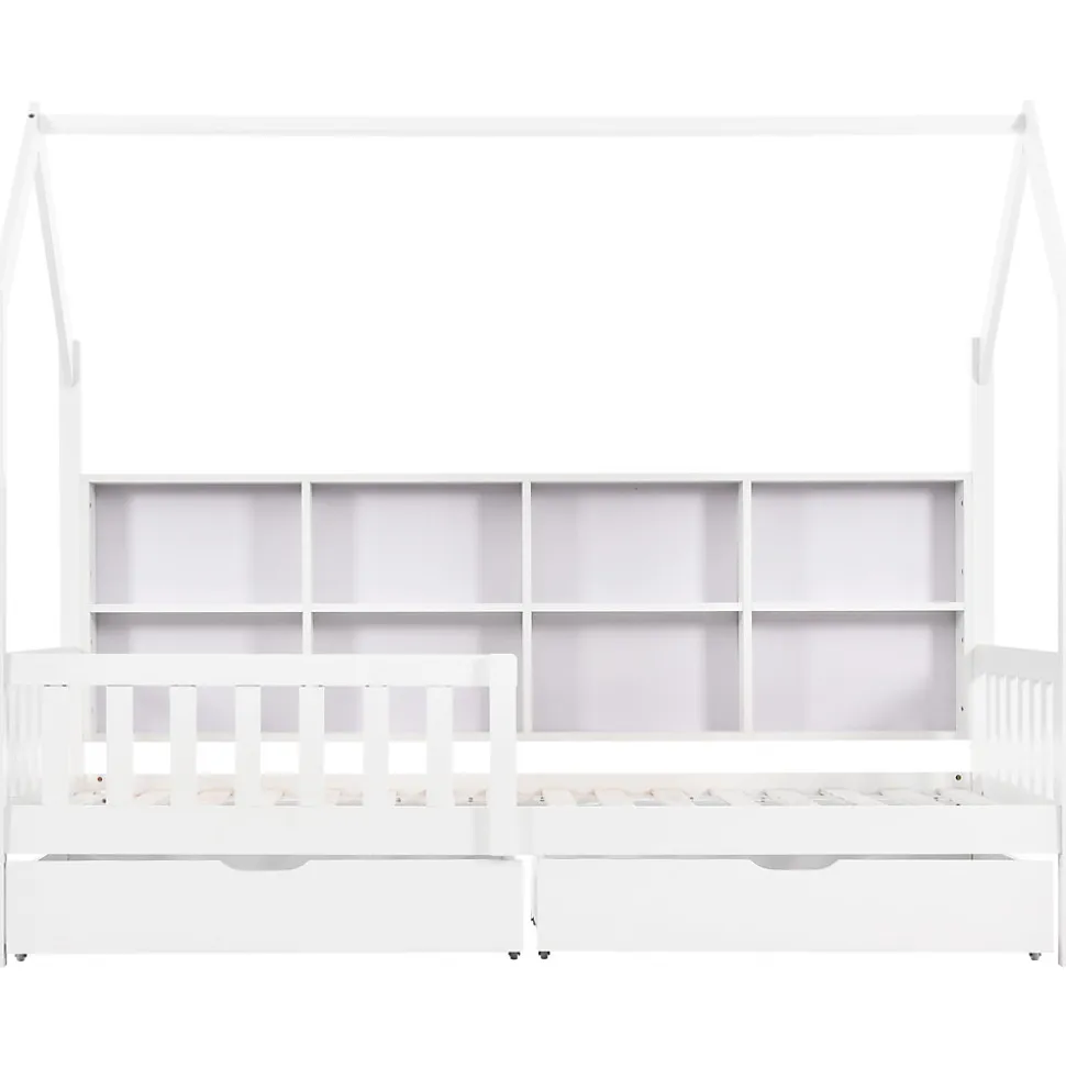 Design & styleCe lit au look de petite maison reprend les codes du style scandinave : lignes simples, bois massif de pin et finition blanche certifiée. L’esthétique minimaliste favorise une ambiance calme et chaleureuse dans la chambre d’enfant.Rangement & fonctionnalitéÉtagère arrière intégrée pour ranger livres, petits jouets et objets du quotidien.Deux grands tiroirs montés sur roulettes sous le sommier pour un accès facile et un rangement optimisé du linge de lit, des vêtements ou des jeux.Configuration pensée pour libérer l’espace et faciliter le rangement au quotidien.Matériaux & sécuritéStructure en bois massif de pin, finition blanche certifiée pour limiter les émissions. Le lit est équipé d’une barrière de protection pour prévenir les chutes et d’un large accès pour faciliter l’entrée et la sortie des enfants. Les tiroirs roulent en douceur pour plus de confort d’usage.Dimensions & capacitéDimensions totales : 204 x 95 x 168,5 cm. Couchage intérieur : 200 x 90 cm (couchage). Charge maximale recommandée : 120 kg. Nombre de lattes : 15. Épaisseur de matelas recommandée : 10 cm à 20 cm. Poids total : environ 53,45 kg.Montage & livraisonMontage requis, estimé à environ 1 heure; deux personnes recommandées. Produit livré en 2 colis qui peuvent arriver séparément. Origine : Chine. Remarque : mesures manuelles susceptibles de présenter de légères tolérances et variations de teinte possibles selon l’éclairage.