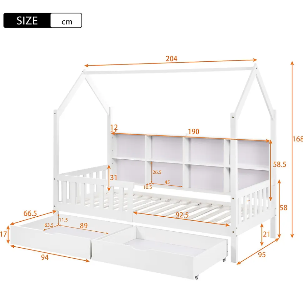 - Rangement optimisé grâce à la tête en forme de maison avec étagère pour livres et jouets, et 2 grands tiroirs montés sur roulettes offrant un espace pour linge de lit, vêtements et jouets.