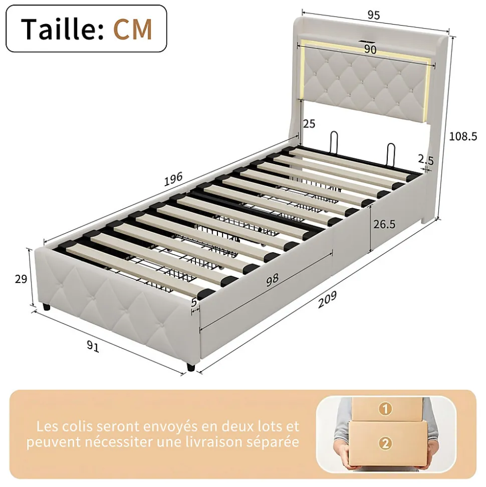 Tissu velours doux et élégant : Revêtement en velours beige de haute qualité, agréable au toucher et confortable pour un sommeil de qualité. Rangement tête de lit et lit à gaz : Compartiments pratiques dans la tête de lit et lit à gaz pour ranger linge de lit, vêtements ou accessoires. Éclairage LED intégré : Lampes décoratives sur la tête de lit pour une ambiance chaleureuse et moderne dans la chambre. Port USB et Type-C pratique : Chargez facilement vos appareils électroniques sans encombrer la chambre avec des câbles supplémentaires. Construction robuste et durable : Structure solide et matériaux de qualité garantissant stabilité, confort et utilisation en toute sécurité au quotidien. Remarque : Taille applicable : 90 x 200 cm (hors matelas) Pour garantir la sécurité, les produits sont expédiés par lots et peuvent ne pas arriver le même jour. Veuillez patienter.