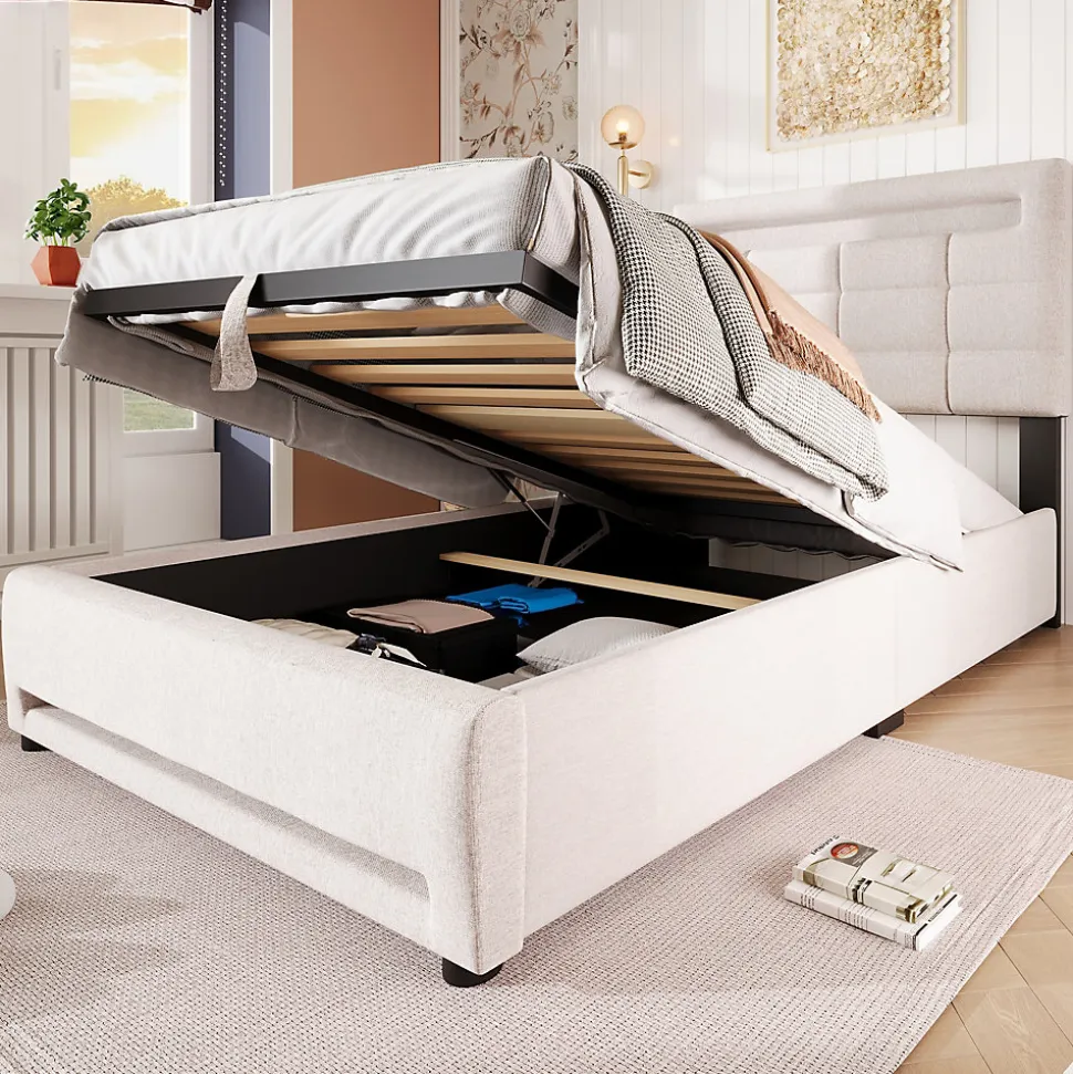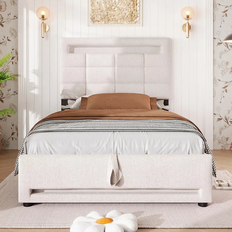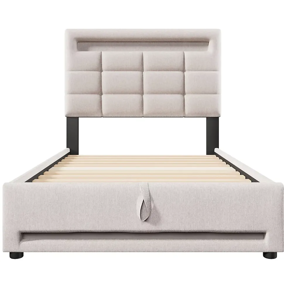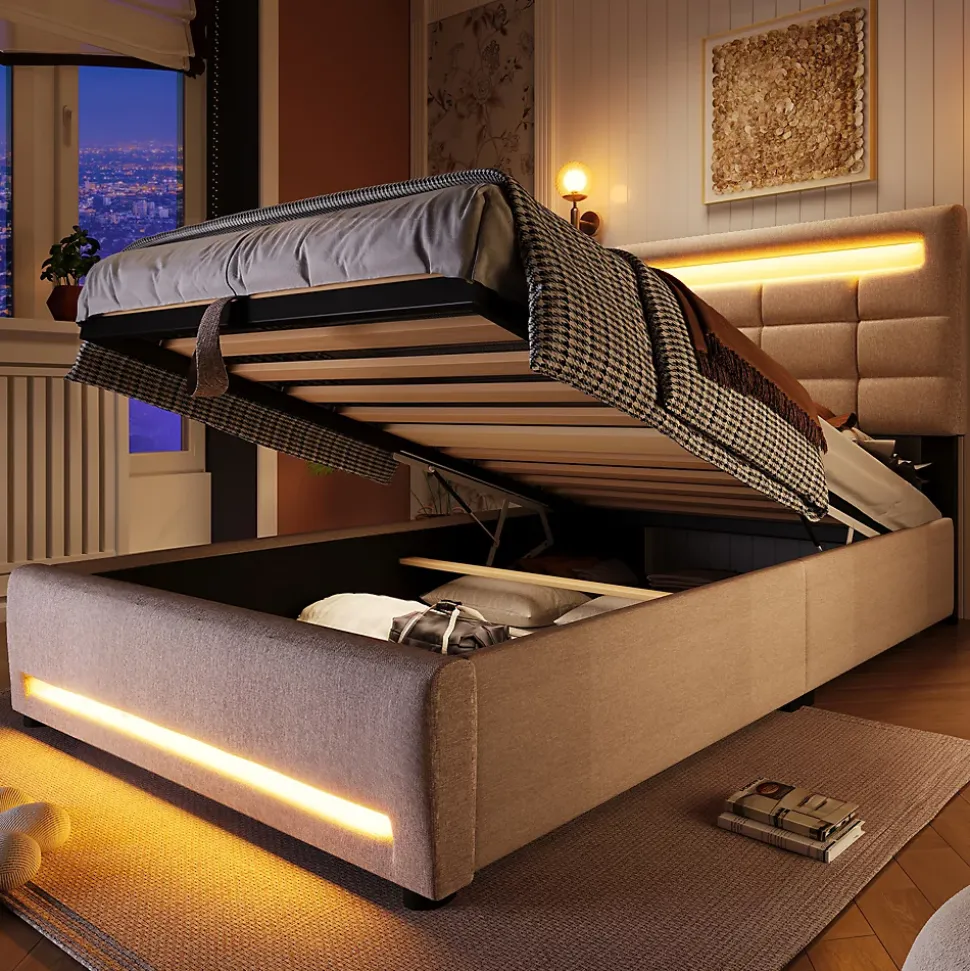 Design & style Ce lit tapissé en lin beige propose une silhouette épurée et un rendu naturel, avec une tête de lit matelassée aux carrés géométriques qui apporte caractère et sobriété à la chambre tout en restant discret.Fonctionnalité & rangement Bande lumineuse LED 16 couleurs intégrée autour de la tête et du pied, pilotable via application mobile pour régler l’ambiance selon vos envies. Sommier relevable à vérins hydrauliques révélant un grand coffre de rangement caché, pratique pour ranger couettes, oreillers et linge de saison. Prise USB intégrée au cadre pour recharger facilement smartphone et petits appareils depuis le lit (matelas non inclus).Matériaux & entretien Structure en panneaux (MDF) recouverte d’un tissu en lin agréable au toucher et conçu pour un usage domestique. Surface facile à entretenir : dépoussiérage régulier et nettoyage local avec un chiffon doux et un produit adapté si nécessaire. Recommandation d’épaisseur de matelas : 15-20 cm.Installation & livraison Produit livré en 2 colis ; montage requis, deux personnes recommandées pour un assemblage sécurisé. Les colis peuvent être livrés séparément. Origine du produit : Vietnam. Poids supporté indiqué : 200 kg.Caractéristiques & conseils Dimensions intérieures pour matelas : 90 x 200 cm. Dimensions extérieures approximatives : 214,6 x 99,1 x 108,5 cm. Nombre de colis : 2. Attention : mesures manuelles susceptibles d’entraîner une tolérance de 2-3 cm et variations de coloris possibles selon l’éclairage et les écrans.