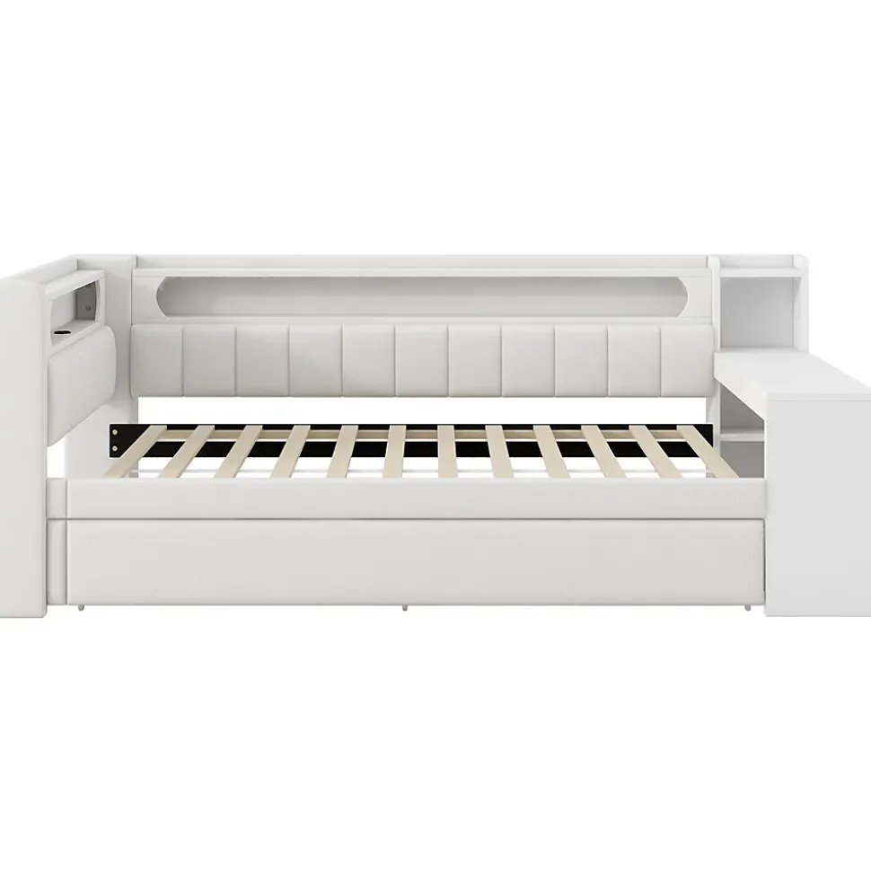 Design & styleCe lit 90×200 cm tapissé se distingue par sa silhouette nette et sa teinte blanche discrète. Le dossier en tissu imitation lin apporte une touche chaleureuse sans dominer la pièce, permettant une intégration aisée dans différents univers décoratifs.Fonctionnalité & rangementTiroir gigogne de couchage 90×190 cm pour accueillir un invité ou optimiser l’espace nuit.Bureau et étagères intégrés pour étudier ou travailler sans empiéter sur la surface de la chambre.Éclairage LED multicolore (7 couleurs) et ports USB intégrés pour plus de praticité au chevet.Matériaux & soliditéStructure en MDF et contreplaqué avec revêtement tapissé, renforts en plywood et 12 lattes Pilwood assurant maintien et stabilité. Dimensions totales : 237 x 103,5 x 93,5 cm ; dimension intérieure du couchage : 90×200 cm. Capacité recommandée : 150 kg. Épaisseur de matelas conseillée : 10–12 cm.Installation, entretien & emballageProduit livré en 3 colis et nécessitant un montage; deux personnes sont recommandées pour un assemblage sûr. Nettoyage simple : dépoussiérage régulier et essuyage avec un chiffon doux. Origine : Chine. Les colis peuvent arriver séparément selon la logistique.