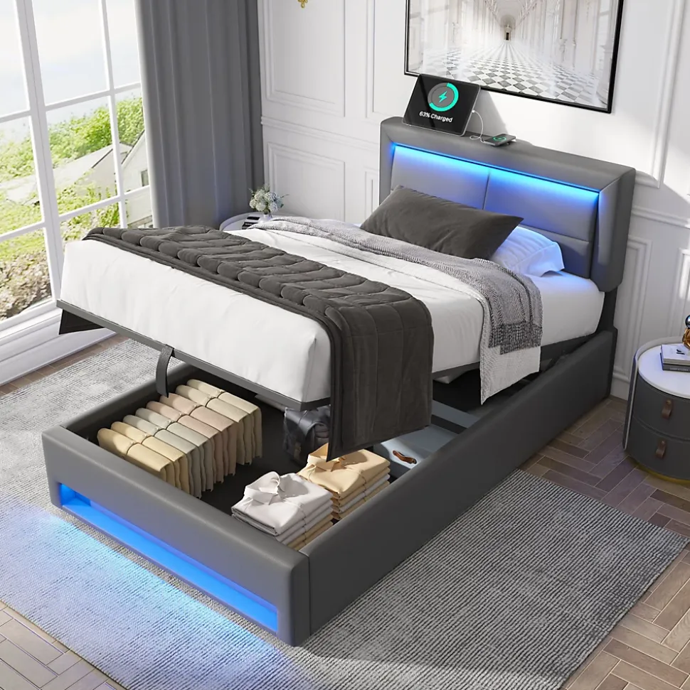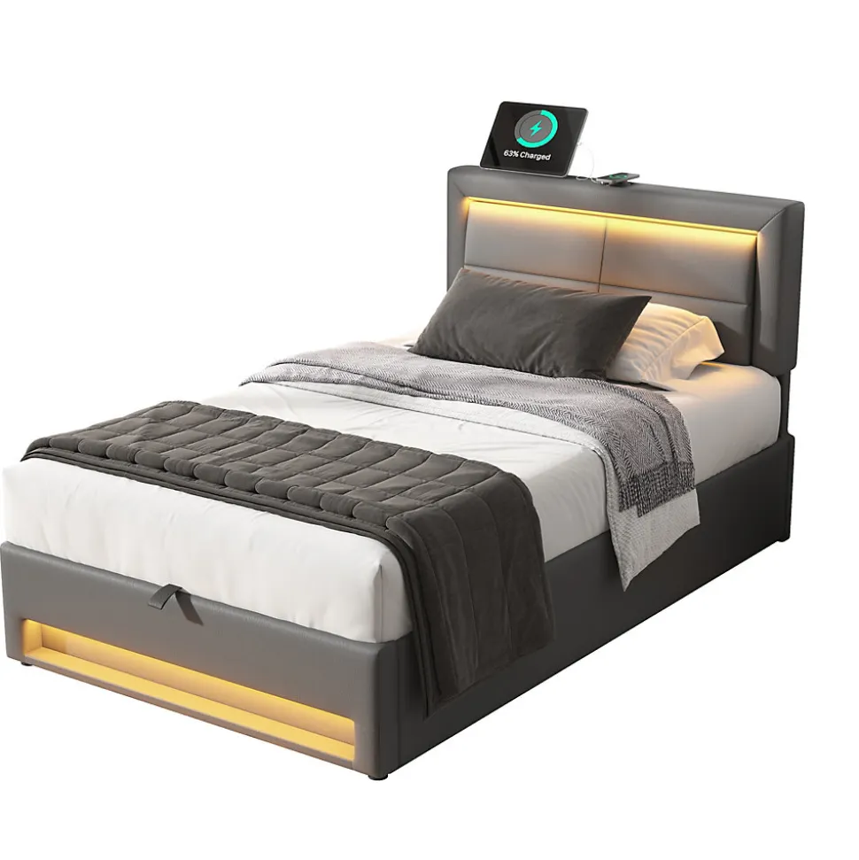 Design & styleCe lit 90×200 cm associe lignes épurées et revêtement en PU gris à effet litchi pour un aspect contemporain et facile à intégrer dans différentes ambiances. La tête et le cadre rembourrés apportent une finition soignée et un confort visuel adapté à la chambre.Fonctionnalité & rangement Éclairage LED multicolore commandé par télécommande offrant 12 nuances pour ajuster l’atmosphère selon l’usage (lecture, détente ou veilleuse). Ports USB intégrés à structure à poussoir : en position relevée deux prises USB sont accessibles pour la charge câblée ; en position rentrée la surface permet le positionnement d’appareils compatibles pour une charge sans fil. Coffre de rangement sous le sommier pour organiser literie, vêtements ou autres objets et optimiser l’espace de la chambre.Matériaux, support & entretienCadre tapissé en PU facile d’entretien, surface nettoyable avec un chiffon doux. Sommier à lattes larges (5 cm) assurant une bonne tenue du matelas et une répartition homogène des charges. Charge maximale recommandée : 150 kg. Convient à un matelas 90×200 cm, épaisseur conseillée 20 à 30 cm.Installation & emballageMontage requis, deux personnes recommandées pour un montage sécurisé. Produit livré en 2 colis pouvant arriver séparément. Poids net : 37,9 kg. Fabrication d’origine Chine. Livré sans matelas.