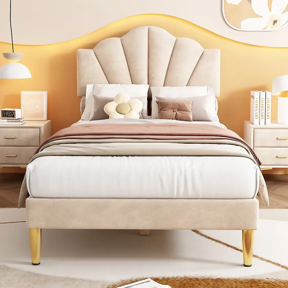 Design & styleCe lit en velours beige associe une tête de lit à contour coquillage et des pieds en métal doré pour une silhouette soignée et graphique. Le revêtement en velours confère une texture douce au toucher tout en apportant une finition discrète et élégante à la chambre.Fonctionnalité & rangement Sommier à 12 lattes en bois massif pour un soutien homogène et une bonne ventilation de la literie. Renforts métalliques en croix assurant la stabilité et une capacité d’usage de 150 kg. Vide sous lit de 22 cm pour ranger boîtes ou housses et optimiser l’espace de la chambre.Matériaux & confortStructure tapissée en velours, tête de lit rembourrée avec mousse haute densité pour un maintien confortable et réglable en deux hauteurs selon vos besoins et l’épaisseur du matelas. Matières principales : velours, bois massif et éléments métalliques.Installation & emballageProduit livré en 1 colis, poids approximatif 26,5 kg. Montage requis, env. 25 minutes ; deux personnes recommandées. Le kit inclut le cadre, les vis, les outils nécessaires et la notice de montage. Matelas non fourni (convient pour matelas 90×200 cm, épaisseur recommandée 20-30 cm).Entretien & remarquesNettoyage simple à l’aide d’un chiffon doux et sec ou légèrement humide. Toutes les dimensions sont données à titre indicatif (ex. dimensions totales approximatives 95x205x120/130 cm). Peut présenter une variation de 2–3 cm et de légères différences de teinte selon l’éclairage. Origine : Chine.