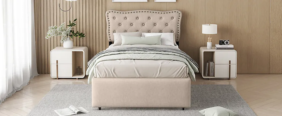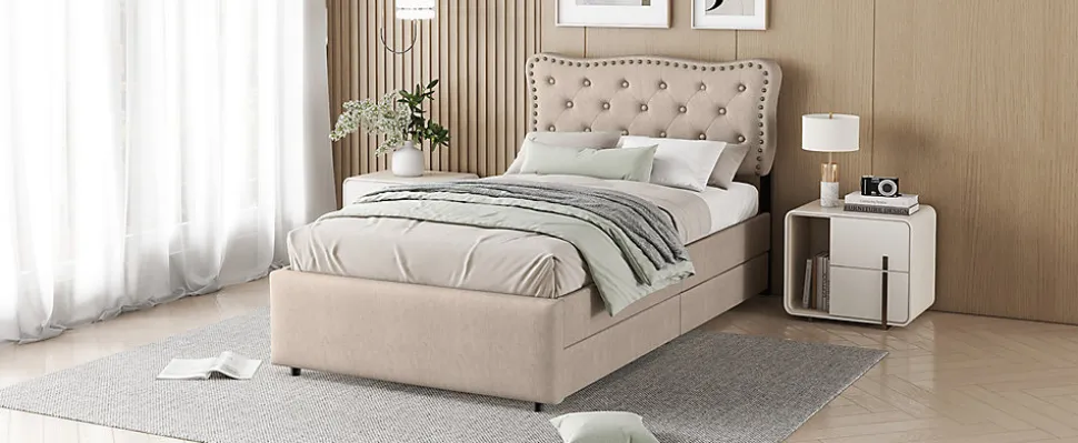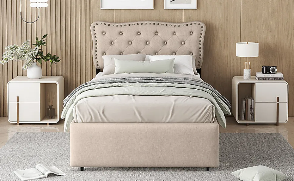 Ce lit beige foncé est la parfaite combinaison d’élégance et de confort ! Il offre un aspect exquis tout en étant pratique pour votre chambre. Avec ses clous décoratifs sur la tête de lit, il ajoutera de l’élégance à votre chambre. Deux tiroirs de rangement facilitent l’organisation et le rangement de vos affaires, contribuant ainsi à un espace propre et ordonné.Caractéristiques principales :Matériaux durables : Fabriqué en MDF et en tissu en lin, ce lit est à la fois élégant et solide, offrant une longue durée de vie.Design épuré : Le lit a une couleur beige foncé qui se marie parfaitement avec de nombreux styles de décoration, apportant une touche sophistiquée à la chambre.Clous décoratifs : La tête de lit est recouverte de tissu, ornée de boutons de la même couleur et de clous décoratifs en cuivre, ajoutant une touche de raffinement.Hauteur réglable de la tête de lit : La hauteur de la tête de lit peut être ajustée à 101,5 cm, 106,5 cm et 111,5 cm, ce qui permet d’adapter le lit à des matelas de 15 à 25 cm.Rangement : Deux tiroirs sous le lit offrent un espace de rangement supplémentaire pour organiser et stocker vos affaires.Dimensions :Dimensions du produit : 203 x 90 x 111.5 cmDimensions du matelas : 90 x 200 cmHauteur totale : 111.5 cmPoids maximal supporté : 200 kgNombre de lattes : 12Recommandation pour l’épaisseur du matelas : 15-25 cmMontage requis : OuiOrigine : Chine
