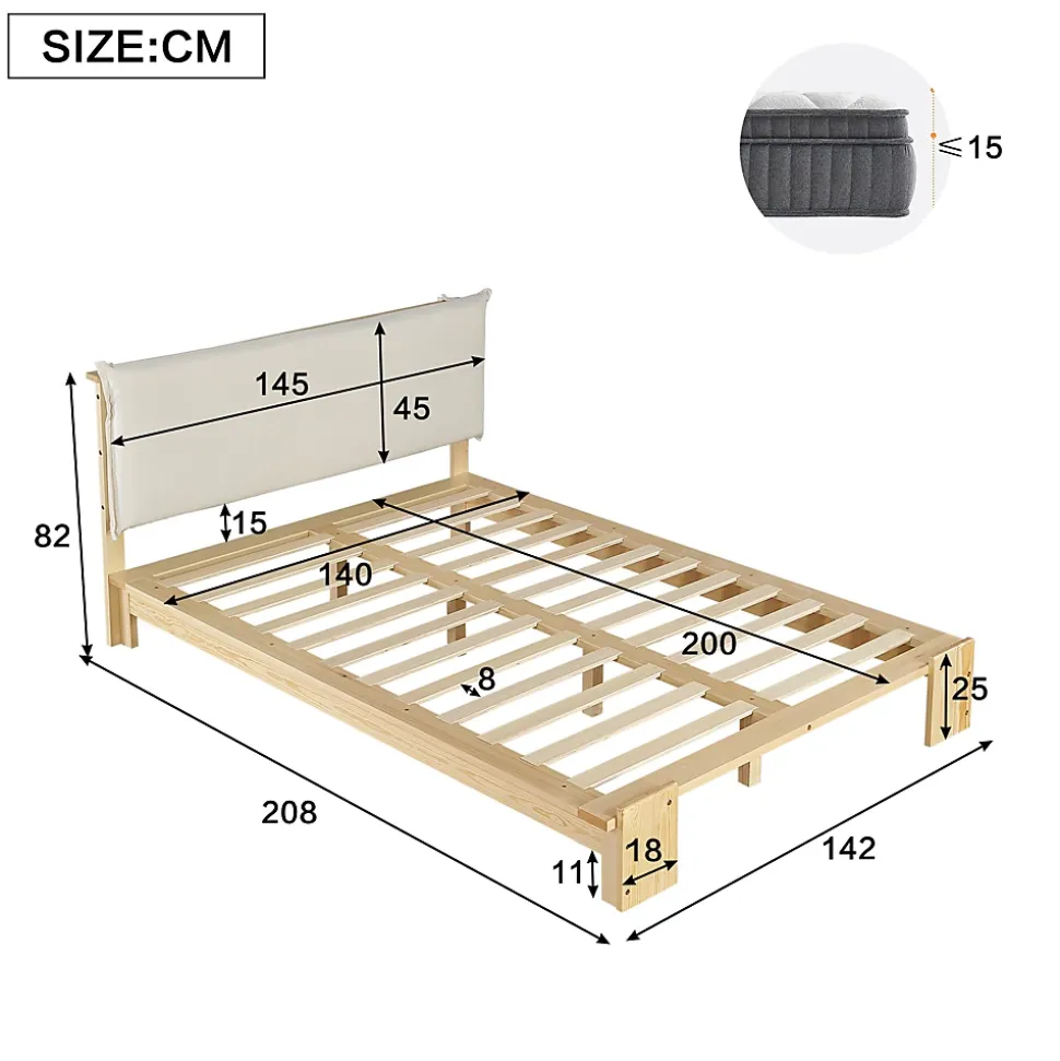 ▶ ▶ Détails ▶────────────────● Nom du produit : Lit double● Couleur : Naturel● Matériau du cadre : Pin + Mousse● Matériau des lattes : Contreplaqué● Dimensions totales : 208 × 145 × 82 cm (L × l × H)● Poids total : 28,5 kg● Matelas compatible (non inclus) : 140 × 200 cm (épaisseur ≤ 15 cm)● Capacité de charge : 240 kg● Méthode de montage : Auto-assemblage● Structure interchangeable de gauche à droite : Non● Dimensions détaillées du produit : Veuillez vous référer à l’image détaillée● Nombre de colis : 2► Remarques ►※ En raison de mesures manuelles, un écart de 2–3 cm peut se produire.※ Toutes les images du produit ont été prises avec le produit réel.※ Des écarts de couleur peuvent survenir en raison de l’exposition au soleil ou d’autres facteurs.※ Le produit est expédié en 2 colis, qui peuvent ne pas arriver en même temps. Merci de patienter.