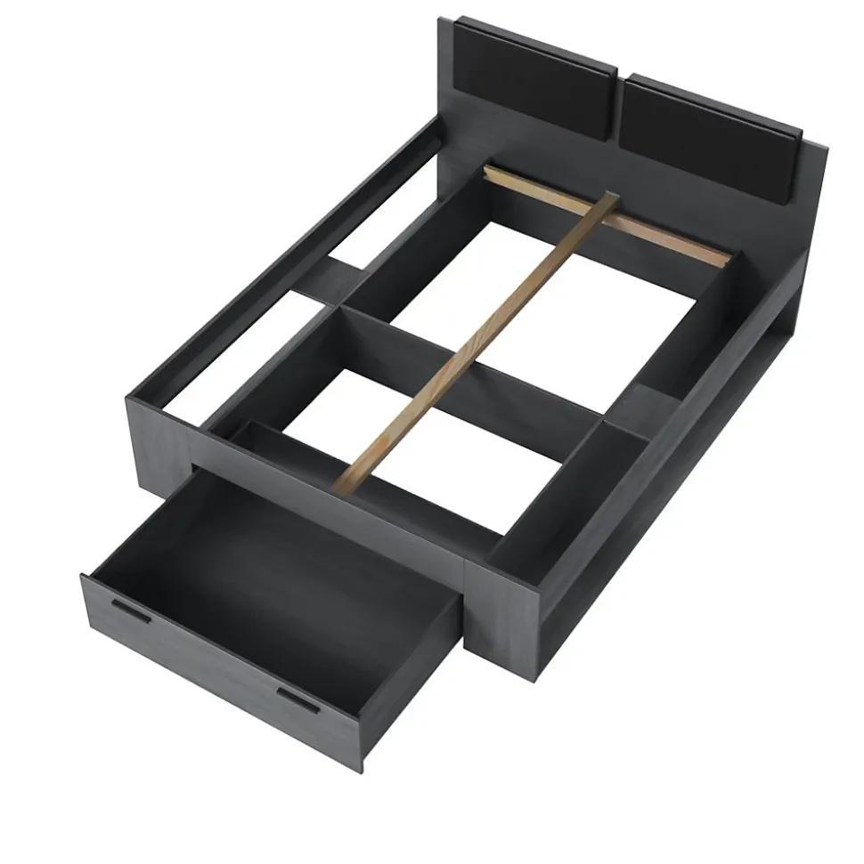 Lit adulte 160×200 avec tiroirs intégrés. Couleur gris effet bois collection FLOYD – Sommier inclusCe lit 2 places de la collection FLOYD fera de votre chambre un véritable cocon, vous permettant de vous détendre et de vous reposer. N’attendez plus, il apportera immédiatement confort et élégance à votre chambre grâce à sa forme design.- COMPOSITION : Lit + tête de lit + sommier + tiroirs- DIMENSIONS : Lit + tête de lit : largeur 166 x Longueur 205 x Hauteur 101cm. (Couchage 160×200 cm)- COLORIS : Gris effet bois.- STRUCTURE: Panneaux de particules et MDF de première qualité.- CARACTÉRISTIQUES : Lit 160×200 avec tiroirs intégrés et sommier. ****MATELAS NON INCLUS**** Lit disponible dans plusieurs dimensions et différents coloris. Retrouvez également le reste de la collection FLOYD dans notre boutique : Armoire, commodes, ensemble de chambre complet…