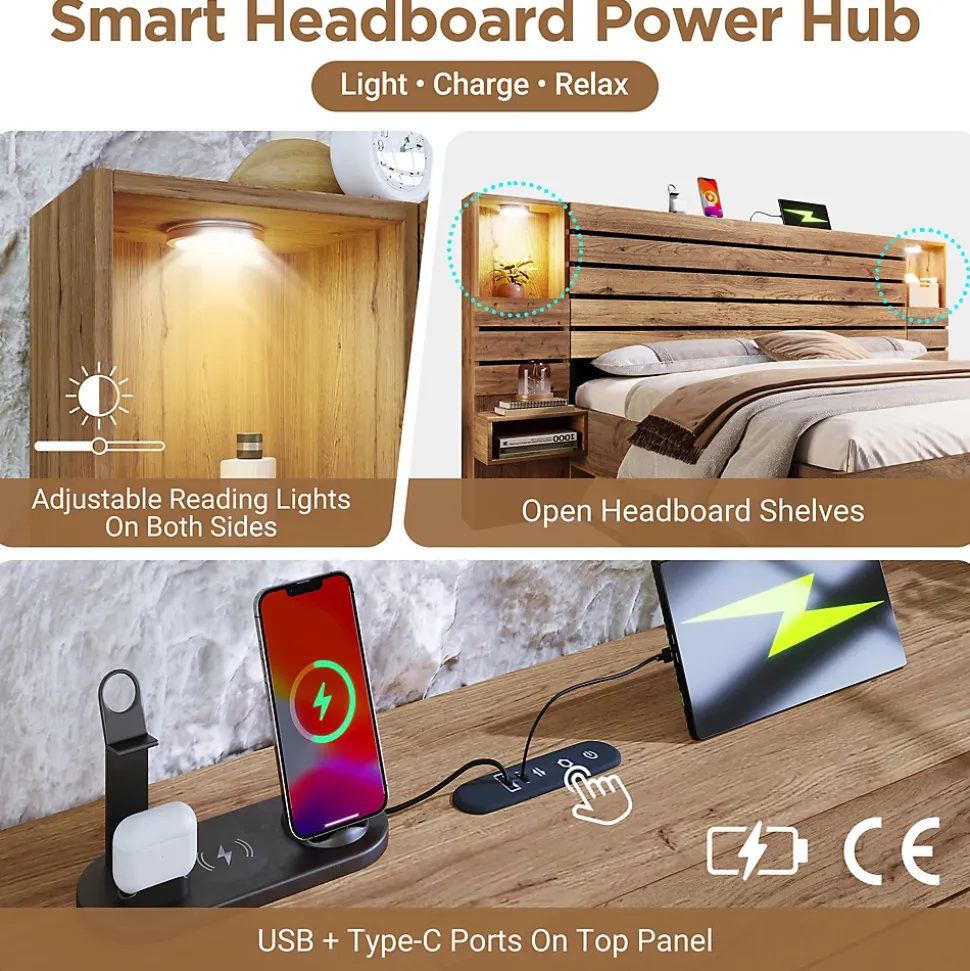 •【Éclairage encastré et ports de chargement】Un spot encastré rond est situé au-dessus des étagères ouvertes de chaque côté de la tête de lit. L’éclairage est commandé par un interrupteur tactile situé sur le dessus de la tête de lit, offrant cinq niveaux de luminosité réglables à l’aide des boutons « + » et « – ». Cet interrupteur intègre des ports de chargement, notamment des interfaces USB et Type-C.•【Niche lumineuse et tables de chevet suspendues】La niche lumineuse de la tête de lit est idéale pour mettre en valeur des œuvres d’art, des cadres photo et autres objets décoratifs, créant ainsi une ambiance chaleureuse et accueillante. Les tables de chevet suspendues de chaque côté du lit offrent un espace de rangement pratique et, grâce à leur conception sur pied, facilitent le nettoyage par les robots aspirateurs.•【Rangement sous le lit】Ce cadre de lit compact et pratique est entouré de tiroirs et de compartiments de rangement. Trois tiroirs spacieux offrent un espace de rangement discret pour divers objets. Grâce à ses quatre roulettes intégrées et à ses poignées de tiroir incurvées, le cadre de lit coulisse en douceur et silencieusement. •【Extérieur en chêne naturel】Ce cadre de lit, revêtu d’un placage en chêne naturel, crée une ambiance chaleureuse et accueillante. Sa structure en fer de haute qualité lui confère robustesse et durabilité. Les lattes intégrées empêchent le matelas de glisser et assurent un soutien stable, pour un sommeil confortable et en toute sécurité.•【Facile à assembler】Des instructions détaillées et des pièces complètes sont disponibles pour vous aider à réaliser l’assemblage rapidement.