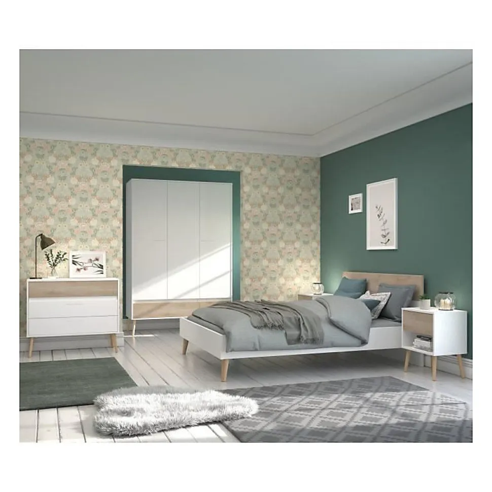Lit adulte AALBORG 140 x 190 cm au style scandinave, structure en panneaux de particules 22 mm avec finition papier décor blanc et chêne, pieds coniques en bois massif, design minimaliste deux tons, montage en kit, sommier et matelas non inclus, garantie pièces 2 ans.