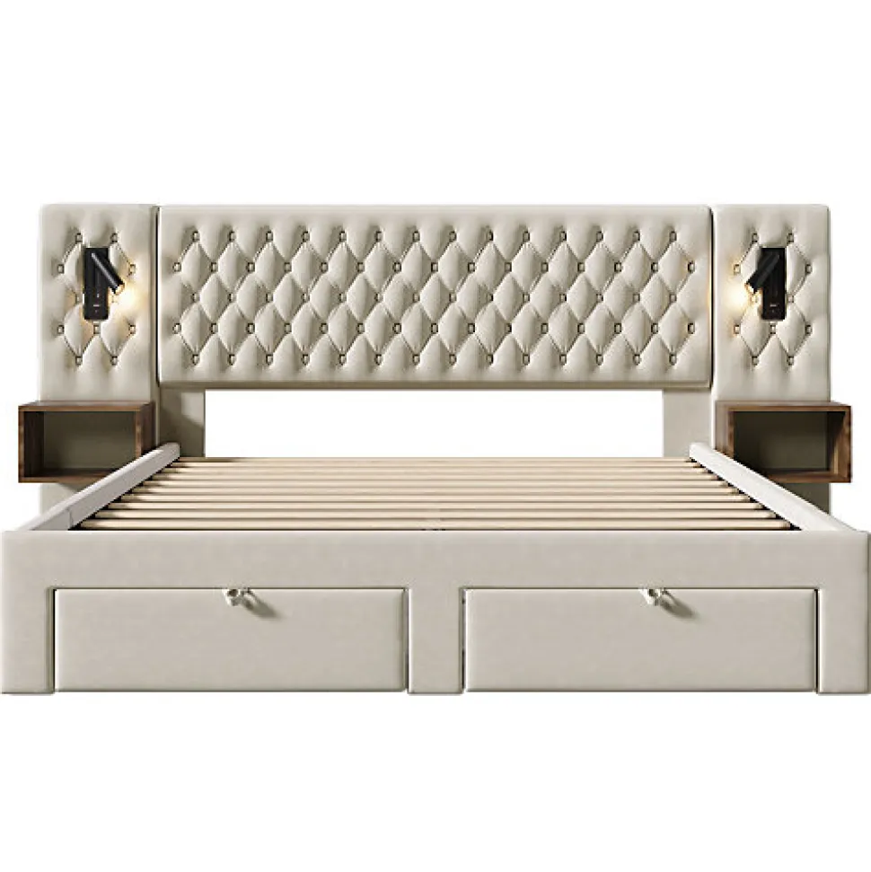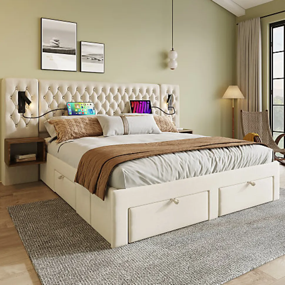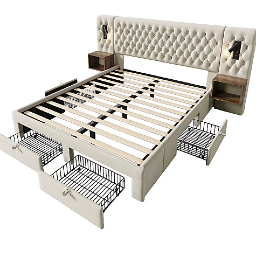 •【Design vintage de haute qualité】Le tissu en velours beige classique est doux et confortable, et la collision visuelle avec la tête de lit en grain de bois met en valeur le goût unique du rétro haut de gamme.•【Grand espace de rangement】Il y a deux tables de chevet en bois d’une capacité de charge de 25 kg, qui peuvent facilement ranger les objets fréquemment utilisés. Il y a quatre tiroirs de grande capacité (59*38*14 cm), deux au bout du lit et un de chaque côté du lit. Ils sont dotés de sangles coulissantes pour un retrait facile, vous permettant d’organiser la literie. la majeure partie de la chambre.•【Éclairage chaleureux】Des lampes de lecture sont installées sur les côtés gauche et droit du lit, offrant un éclairage doux la nuit. Equipé d’un port de chargement USB, vous pouvez charger vos appareils électroniques. Créez un environnement confortable et douillet pour lire avant de vous coucher.•【Système de support stable】Le cadre de lit est fait de métal peint robuste et peut supporter jusqu’à 800 livres. Le cadre est encastré et la tête de lit est dotée de languettes latérales plus larges pour empêcher le matelas de basculer. Le tuyau en fer avec bandes silencieuses en EVA peut réduire les problèmes de bruit lors d’une utilisation quotidienne et offrir une expérience de sommeil plus silencieuse.