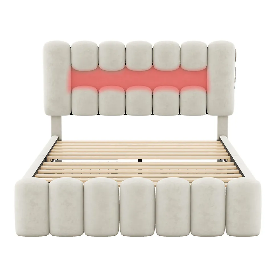Dimensions totales :222x151x124/131.5 cm (LxPxH)Capacité de charge :250kgCouleur :BeigeMatériau :Velours + Panneau composite de fibres de bois à densitéSurface de couchage :140×200 cmNombre de paquets : 3Poids net :61.50kgMontage nécessaire : OuiMatelas inclus : NonMatériaux de haute qualité : Le tissu de velours confortable a été sélectionné pour offrir une sensation de chaleur et de confort, pour une expérience de sommeil des plus agréables et des plus reposantes.Fonction de rangement : Ce lit dispose de 4 tiroirs de grande capacité pour ranger les vêtements et autres objets, ce qui rend votre chambre plus ordonnée.Conception multifonctionnelle : Ce lit est équipé de haut-parleurs, d’un port USB et d’une bande lumineuse LED.Stable et durable : Le cadre du lit est fabriqué en Panneau composite de fibres de bois à densité solide et en panneaux de particules. Le cadre métallique en forme de croix offre un support solide et résistant pour des charges allant jusqu’à 250 kg. Cette construction garantit la durabilité et la stabilité du cadre de lit.Conception flexible : La tête de lit est équipée de deux trous réglables pour s’adapter à différentes hauteurs de matelas, ce qui vous offre une grande variété d’options. La hauteur de la tête de lit peut être réglée à 124 cm et 131,5 cm.Les dimensions du lit sont 222x151x 124(131.5) cm et le lit est envoyé en trois colis. Il arrive que les trois colis n’arrivent pas le même jour. Veuillez patienter 2 ou 3 jours supplémentaires ou contacter notre service clientèle.Remarques :En raison des mesures manuelles, une erreur de 2 à 3 cm peut se produire.En raison de la lumière, il peut y avoir des différences de couleur entre l’image du produit et le produit réel.Veuillez vous référer au produit que vous avez réellement reçu.