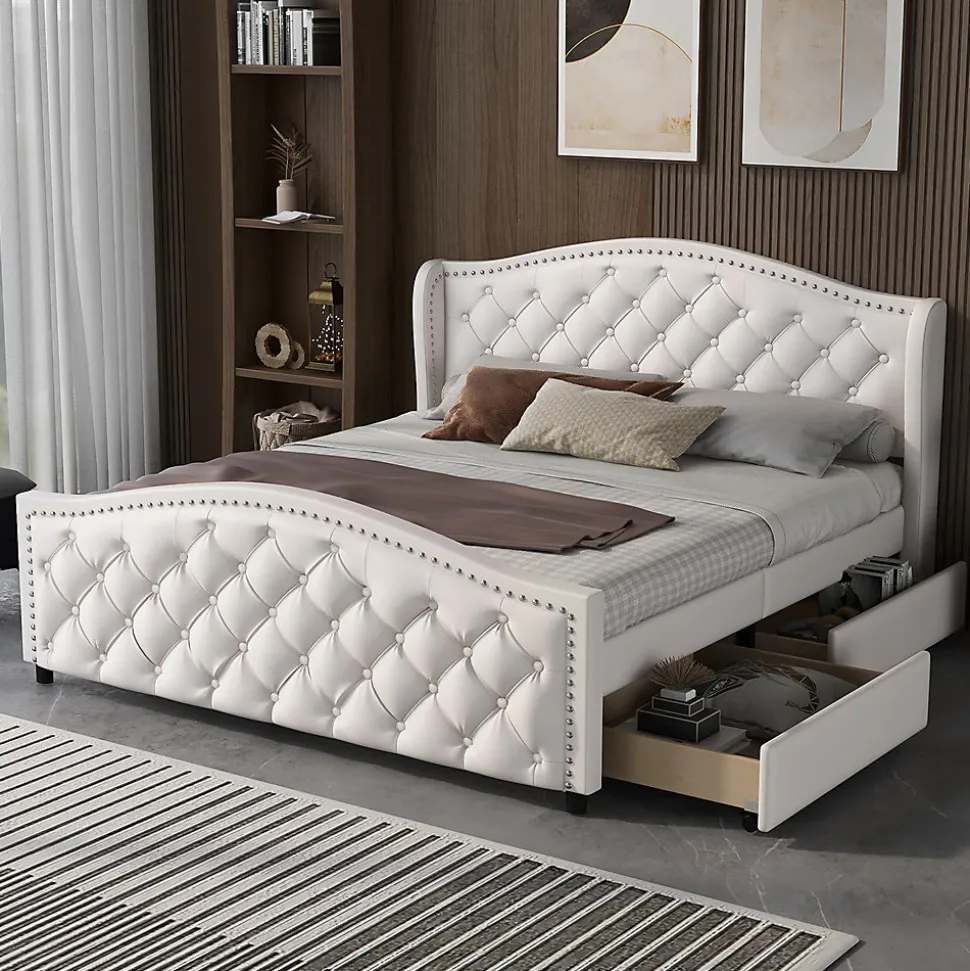 Dimensions totales :212.5x146x100cm(LxLxH)Capacité de charge :300kgCouleur :blancMatériau :PU+MétalNombre de paquets : 2Poids net (kg) : 47.00kgMontage nécessaire : OuiMatelas inclus : NonConception du style:Conçu dans un style Chesterfield, l’aspect est beau et discret. La tête de lit plus haute (99 cm) offre un soutien plus stable et plus confortable pour la tête et le dos. Le lit rembourré est fabriqué en tissu de velours, qui est doux et agréable au toucher et vous offre une expérience de sommeil parfaite.Apparence exquise:L’apparence étonnante d’un lit finement rembourré avec une tête de lit haute dotée d’un matelassage en losange caractéristique et de gros boutons, d’un panneau latéral en forme d’oreille de chaque côté de la tête de lit et d’un anneau de clous argentés autour du bord du panneau latéral. Ce design unique et sophistiqué et les finitions de haute qualité permettent au lit rembourré de combiner des styles modernes et classiques pour donner à votre chambre à coucher un tout nouveau look.Un vaste espace de rangement:Les 2 tiroirs sur roulettes offrent un espace de rangement pour les oreillers, les couvertures, etc. Les tiroirs peuvent être placés à gauche ou à droite, et les tiroirs peuvent être facilement tirés des deux côtés grâce aux roulettes situées sous le lit double.Configuration haut de gamme:Le cadre du lit est composé de bois de haute qualité, d’un cadre en acier et d’éléments de liaison. Le sommier est solide et se compose de pin massif et de supports centraux en acier. Les lattes plus épaisses offrent un soutien optimal à votre propre matelas. Contenu de la livraison du lit capitonné : Cadre de lit, sommier à lattes, instructions de montage (matelas non inclus).
