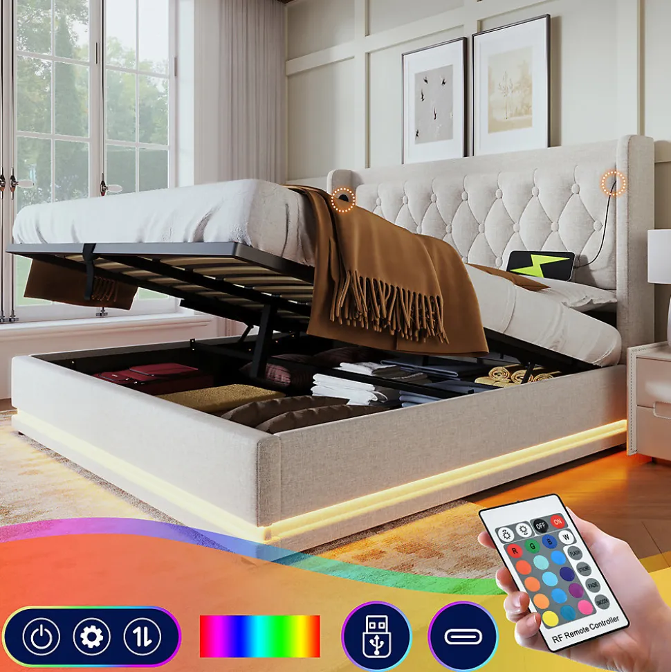 Dimensions totales :210x150x100.5cm(LxLxH)Capacité de charge :300KG/660LBSCouleur :BeigeMatériau :CotonNombre de paquets : 2Poids net (kg) : 41.62kgMontage nécessaire : OuiMatelas inclus : NonStyle classique et design pratique :La tête de lit présente un design classique et touffeté avec des boutons pour soutenir délicatement votre cou et créer un environnement de sommeil douillet.Avec une largeur maximale de 16 cm, le offre une tranquillité d’esprit pour une nuit de sommeil réparateur. Grâce aux ports de charge USB et Type-C situés de part et d’autre du vous pouvez utiliser vos appareils électroniques au lit quand vous le souhaitez sans craindre de tomber en panne de batterie.Espace de rangement sous le lit :Le lit relevable avec rangement est doté d’une conception unique d’élévateur hydraulique à air de haute qualité qui offre un vaste espace de rangement sous le lit et peut être facilement relevé, abaissé ou fermé. Il est parfait pour ranger les objets encombrants ainsi que les objets peu utilisés. Le dessous du lit est recouvert d’un tissu non tissé qui empêche la poussière de pénétrer et permet de garder les choses bien rangées.Système de support solide :Le cadre du lit est fabriqué en acier de haute qualité et les pieds renforcés empêchent la structure de se tordre. Cadre en acier de haute qualité avec des lattes élastiques de haute qualité pour soutenir le dos et fournir une bonne expérience de sommeil, le lit est livré avec une bande d’arrêt pour empêcher le matelas de glisser.Éclairage LED innovant :La bande lumineuse LED à 3 côtés du lit, au design innovant, permet de changer 16 couleurs. Vous pouvez régler différents modes de clignotement et de luminosité pour créer un spectacle lumineux impressionnant entouré de trois côtés pour vous donner une atmosphère de sommeil impressionnante.