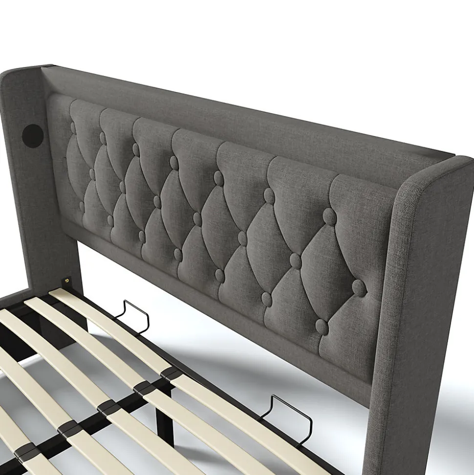 Dimensions totales :210x150x100.5cm(LxLxH)Capacité de charge :300KG/660LBSCouleur :grisMatériau :CotonNombre de paquets :2Poids net (kg) : 41.62kgMontage nécessaire : OuiMatelas inclus : NonStyle classique et design pratique :La tête de lit présente un design classique et touffeté avec des boutons pour soutenir délicatement votre cou et créer un environnement de sommeil douillet.Avec une largeur maximale de 16 cm, le offre une tranquillité d’esprit pour une nuit de sommeil réparateur. Grâce aux ports de charge USB et Type-C situés de part et d’autre du vous pouvez utiliser vos appareils électroniques au lit quand vous le souhaitez sans craindre de tomber en panne de batterie.Espace de rangement sous le lit :Le lit relevable avec rangement est doté d’une conception unique d’élévateur hydraulique à air de haute qualité qui offre un vaste espace de rangement sous le lit et peut être facilement relevé, abaissé ou fermé. Il est parfait pour ranger les objets encombrants ainsi que les objets peu utilisés. Le dessous du lit est recouvert d’un tissu non tissé qui empêche la poussière de pénétrer et permet de garder les choses bien rangées.Système de support solide :Le cadre du lit est fabriqué en acier de haute qualité et les pieds renforcés empêchent la structure de se tordre. Cadre en acier de haute qualité avec des lattes élastiques de haute qualité pour soutenir le dos et fournir une bonne expérience de sommeil, le lit est livré avec une bande d’arrêt pour empêcher le matelas de glisser.Éclairage LED innovant :La bande lumineuse LED à 3 côtés du lit, au design innovant, permet de changer 16 couleurs. Vous pouvez régler différents modes de clignotement et de luminosité pour créer un spectacle lumineux impressionnant entouré de trois côtés pour vous donner une atmosphère de sommeil impressionnante.