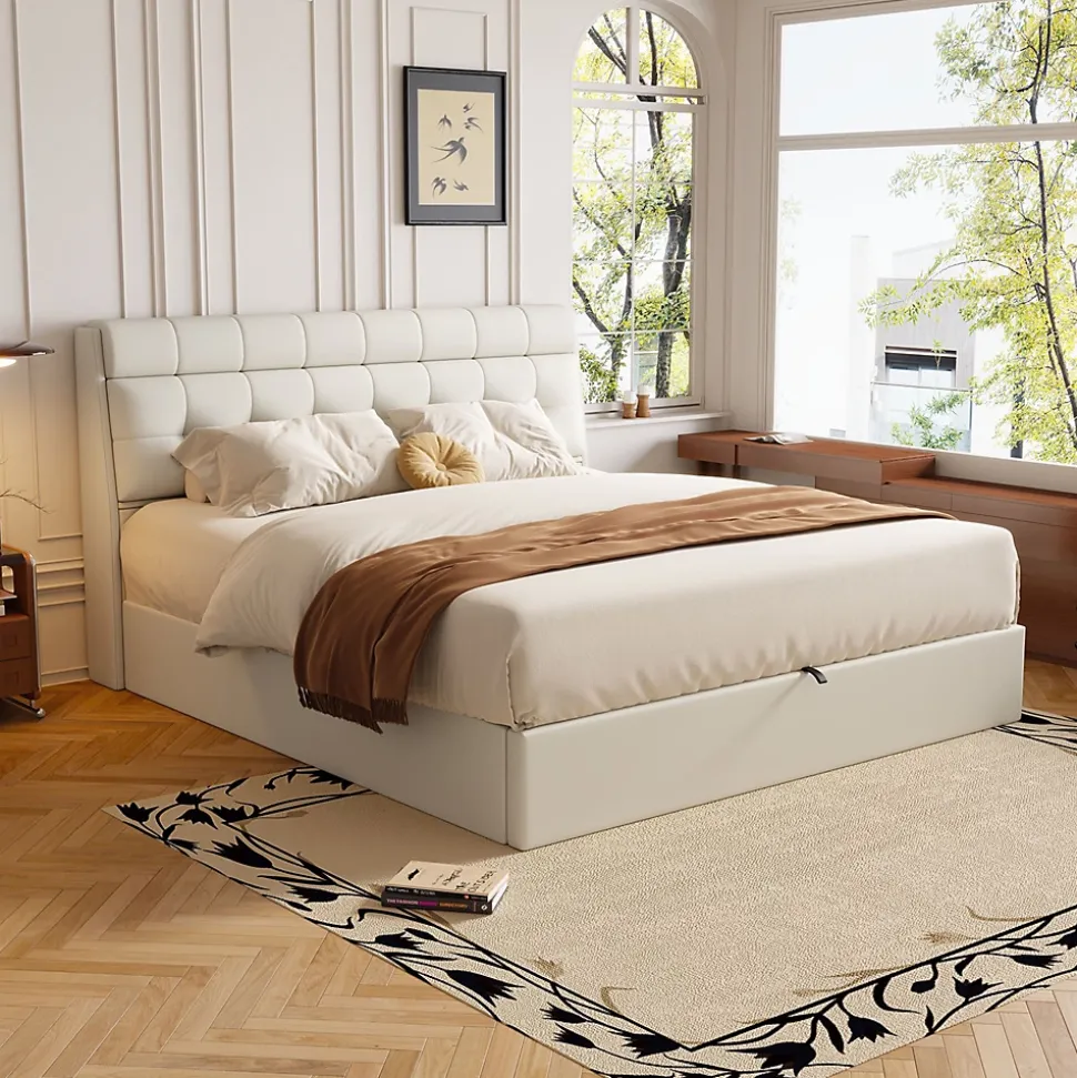 Dimensions totales :200x143x105 cm (LxPxH)Capacité de charge :300kgCouleur :blanc crèmeMatériau :PUSurface de couchage :140×200 cmNombre de paquets : 2Poids net :51.99 kgMontage nécessaire : OuiMatelas inclus : NonESPACE DE RANGEMENT MULTIFONCTIONNEL : La tête de lit et le sommier disposent tous deux d’un espace de rangement caché qui peut être utilisé pour ranger le linge de lit, les vêtements ou d’autres articles afin de garder votre chambre à coucher bien rangée et organisée.CADRE DE LIT HYDRAULIQUE : Le cadre de lit hydraulique vous permet de soulever facilement le matelas pour utiliser l’espace de rangement du sommier. Facile à utiliser, il permet d’économiser du temps et de l’énergie.Le matériau PU est confortable et durable : Le lit est fabriqué en PU, qui est non seulement doux et confortable au toucher, mais aussi facile à nettoyer et à entretenir.Le sommier à lattes offre un bon soutien : Le sommier à lattes du cadre de lit peut répartir uniformément le poids du matelas, fournir un bon soutien au matelas et prolonger sa durée de vie.Design élégant et moderne : Ce lit a un style nouveau et une apparence à la mode, adapté à la décoration des chambres à coucher modernes, ajoutant un sens de la mode à votre chambre à coucher.Remarques :En raison des mesures manuelles, une erreur de 2 à 3 cm peut se produire.En raison de la lumière, il peut y avoir des différences de couleur entre l’image du produit et le produit réel.Veuillez vous référer au produit que vous avez réellement reçu.