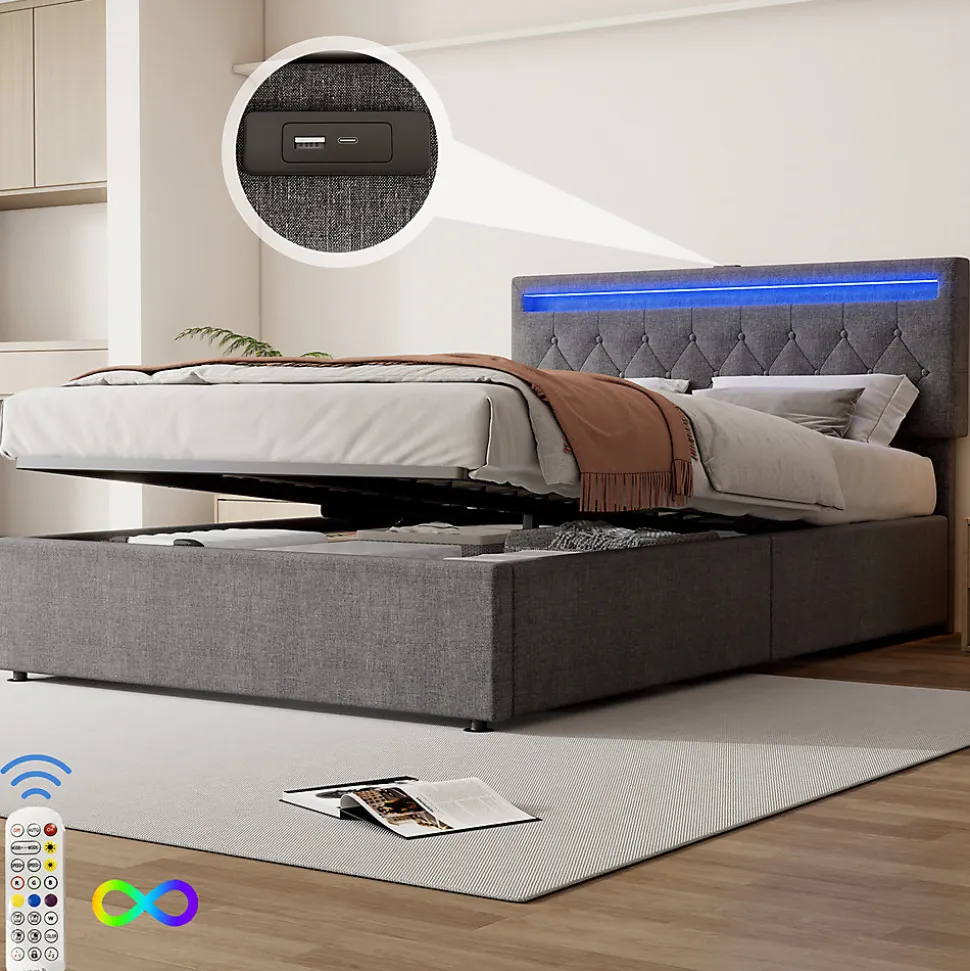 Dimensions totales :210×148.5×92.5/97.5cm(LxLxH)Capacité de charge :200 kgCouleur :grisMatériau :Lin + Panneau composite de fibres de bois à densitéNombre de paquets : 2Poids net (kg) : 42.00kgMontage nécessaire : OuiMatelas inclus : NonMatériaux de haute qualité : Le corps du lit est fabriqué en tissu de lin et en Panneau composite de fibres de bois à densité, des matériaux durables, dotés d’une structure solide et stable. Le tissu en lin est respirant et agréable au toucher ; le panneau Panneau composite de fibres de bois à densité a une excellente capacité de charge et est imperméable à l’humidité, de sorte que le corps du lit ne se déformera pas et ne s’abîmera pas pendant une utilisation à long terme.Dispositif de levage hydraulique : Le cadre du lit est équipé d’un dispositif de levage hydraulique, et l’espace de rangement sous le lit est conçu pour utiliser efficacement l’espace vertical sous le lit, ce qui permet de ranger facilement les objets rarement utilisés et de garder la chambre à coucher bien rangée.Lumière d’ambiance LED à couleur changeante : La lumière d’ambiance LED installée au-dessus de la tête de lit est également équipée d’une fonction de changement de couleur télécommandée. L’utilisateur peut régler la couleur de la lumière en fonction de son humeur ou des conditions ambiantes, créant ainsi une atmosphère de sommeil romantique, chaleureuse ou calme qui apporte plaisir et confort à la maison.Port de charge pratique : Ce lit est également équipé de ports de charge USB et Type-C afin que les utilisateurs puissent charger leurs téléphones mobiles, tablettes et autres appareils à tout moment pendant le repos, répondant ainsi à la demande moderne de commodité pour le chargement des appareils électroniques.