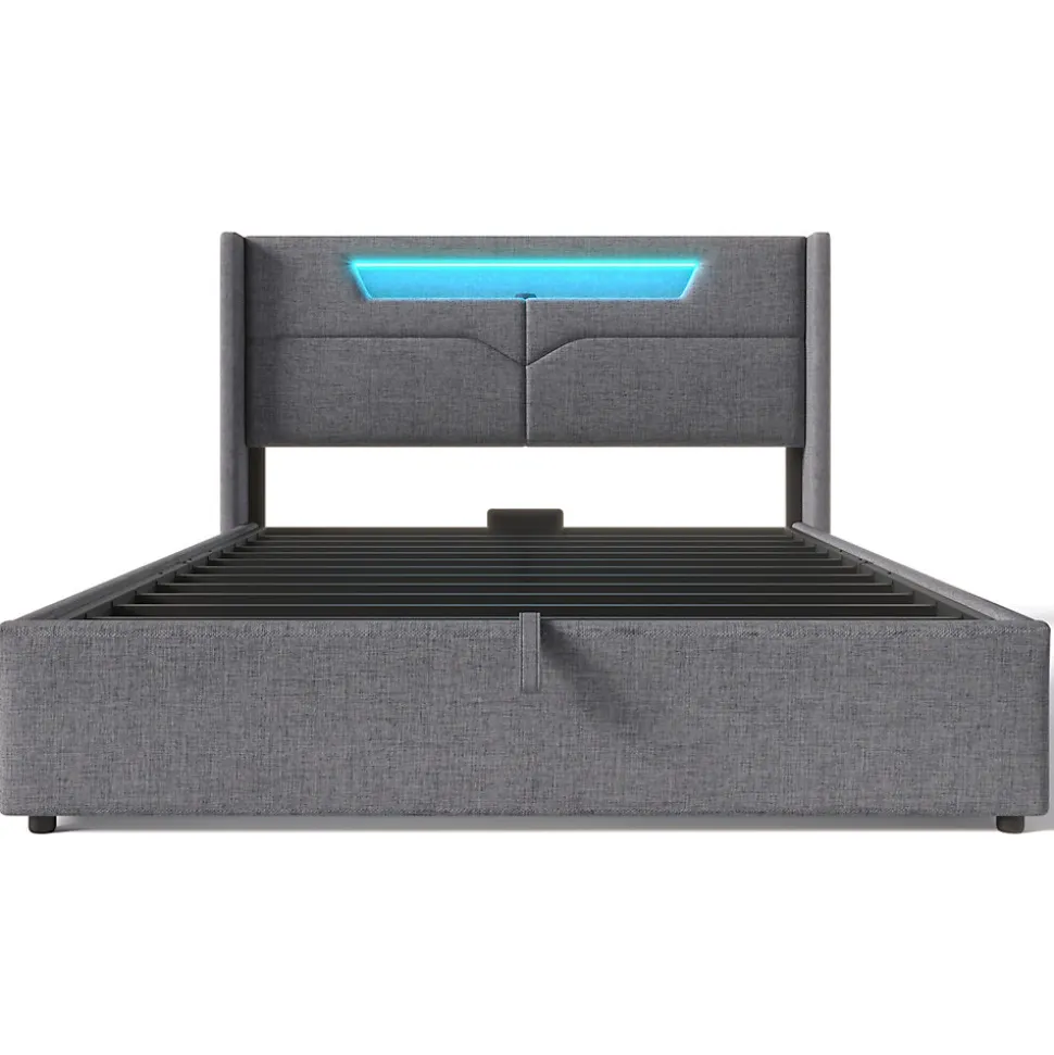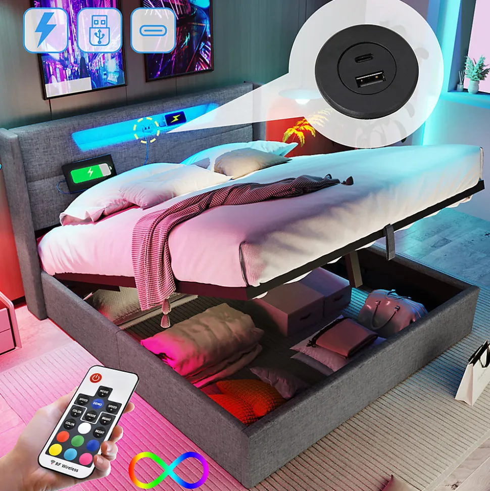 Dimensions totales:212x144x107cm(LxlxH)Capacité de charge:300kg/600lbsCouleur:grisMatériau:linSurface de couchage:140×200 cmNombre de paquets: 2Poids net (kg):49.00kgMontage nécessaire:OuiMatelas inclus:NonDesign chaleureux et confortable:Le corps du lit est enveloppé d’un tissu en lin, la tête de lit est remplie d’éponge, les lignes sont sculptées en forme de V, l’éclairage LED éblouissant donne une double impression de modernité et de rétro. La tête de lit est surmontée d’une oreille latérale, ce qui vous donne un sentiment de sécurité, comme un câlin lorsque vous dormez.Éclairage LED à la tête du lit:L’éclairage LED à la tête du lit ajoute une touche de modernité à votre chambre à coucher. Grâce à la télécommande, vous pouvez changer les couleurs, les vitesses et la luminosité afin de créer une atmosphère unique pour vos moments de repos, en fonction de votre humeur.Station de recharge avec port USB:L’une des caractéristiques les plus utiles est la prise USB intégrée à la tête du lit, qui dispose à la fois d’un port USB intégré et d’un port de type C pour vous permettre de recharger votre téléphone portable et votre tablette avant d’aller vous coucher.Espace de rangement flexible et spacieux:Les téléphones portables peuvent être rangés à la tête du lit. Soutenu par des vérins à gaz, l’espace situé sous les sommiers à lattes peut être utilisé pour ranger des objets volumineux. Le sommier à lattes peut être facilement relevé en soulevant les bandes de tissu.Détails:Ce lit est recouvert d’un tissu en lin gris et est disponible en deux tailles : 140x200cm. Le cadre principal est en fer pour assurer la stabilité du lit et a une capacité de charge de 660lbs pour fournir un support confortable pour le sommeil.Informations détaillées:Lorsque vous déplacez le lit, veuillez le soulever au lieu de le traîner sur le sol.