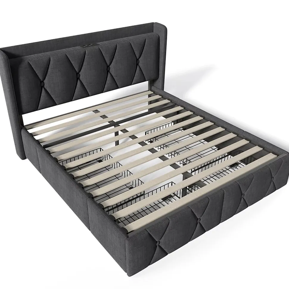 Dimensions totales :217x169x116cm(LxLxH)Capacité de charge :200KG/440LBSCouleur :grisMatériau :linNombre de paquets : 2Poids net (kg) : 50.00kgMontage nécessaire : OuiMatelas inclus : NonAvec un style supérieur :Avec une tête de lit à boutons en forme de diamant et un luxueux revêtement gris recouvrant l’ensemble du cadre, ce lit est à la fois élégant et confortable. La couleur grise est parfaite pour la polyvalence du design, car elle s’adapte à une variété de styles d’intérieur.Une chambre à coucher organisée :Quatre tiroirs offrent un grand espace de rangement, idéal pour la literie ou les vêtements supplémentaires. Avec un tiroir de chaque côté du lit et deux au pied du lit, il est important d’avoir suffisamment d’espace dans la pièce pour accéder aux quatre tiroirs.Tête de lit avec prises de courant et ports USB :L’une des caractéristiques les plus pratiques est la prise intégrée à la tête du lit, que vous pouvez utiliser pour recharger votre téléphone portable et votre tablette avant de vous coucher. Chaque prise est équipée de deux ports de charge aux normes européennes et de deux ports USB.Exceptionnellement durable :Fabriqué à partir de matériaux de haute qualité, ce lit de rangement promet de vous servir pendant des années. Le revêtement en tissu de lin gris est durable dans le temps et les pieds en métal offrent un soutien supplémentaire pour un niveau de soutien exceptionnel qui va de pair avec un confort exemplaire.Assemblage efficace :Le lit de rangement à 4 tiroirs en tissu gris est livré à plat et prêt à être assemblé. Les bricoleurs n’ont pas à s’inquiéter car la conception innovante rend l’assemblage simple, surtout lorsqu’il est combiné avec les instructions claires et complètes incluses avec chaque achat et également disponibles en ligne.