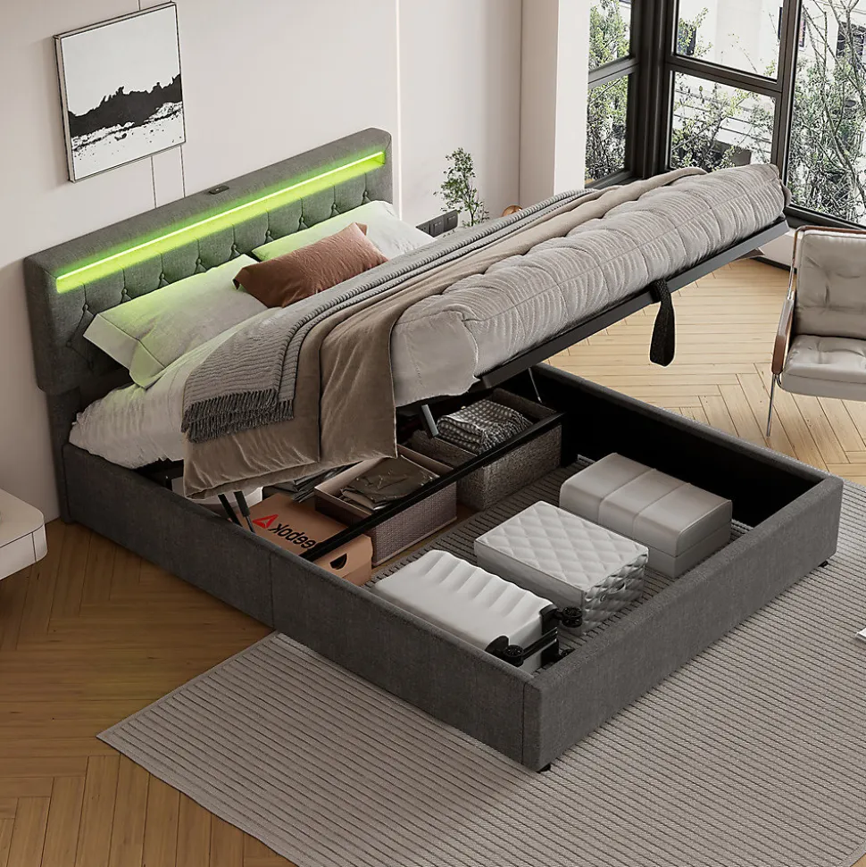 Dimensions totales :210.5×168.5×92/97cm(LxLxH)Capacité de charge :220 kgCouleur :grisMatériau :Lin + Panneau composite de fibres de bois à densitéNombre de paquets : 2Poids net (kg) : 45.20kgMontage nécessaire : OuiMatelas inclus : NonMatériaux de haute qualité : Le corps du lit est fabriqué en tissu de lin et en Panneau composite de fibres de bois à densité, des matériaux durables, dotés d’une structure solide et stable. Le tissu en lin est respirant et agréable au toucher ; le panneau Panneau composite de fibres de bois à densité a une excellente capacité de charge et est imperméable à l’humidité, de sorte que le corps du lit ne se déformera pas et ne s’abîmera pas pendant une utilisation à long terme.Dispositif de levage hydraulique : Le cadre du lit est équipé d’un dispositif de levage hydraulique, et l’espace de rangement sous le lit est conçu pour utiliser efficacement l’espace vertical sous le lit, ce qui permet de ranger facilement les objets rarement utilisés et de garder la chambre à coucher bien rangée.Lumière d’ambiance LED à couleur changeante : La lumière d’ambiance LED installée au-dessus de la tête de lit est également équipée d’une fonction de changement de couleur télécommandée. L’utilisateur peut régler la couleur de la lumière en fonction de son humeur ou des conditions ambiantes, créant ainsi une atmosphère de sommeil romantique, chaleureuse ou calme qui apporte plaisir et confort à la maison.Port de charge pratique : Ce lit est également équipé de ports de charge USB et Type-C afin que les utilisateurs puissent charger leurs téléphones mobiles, tablettes et autres appareils à tout moment pendant le repos, répondant ainsi à la demande moderne de commodité pour le chargement des appareils électroniques.