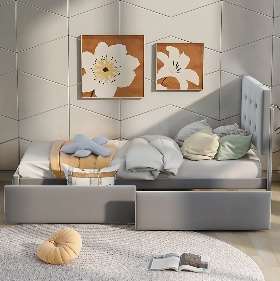 Dimensions totales :208.5*95*94-100cm(PxLxH)Capacité de charge :200 kgCouleur :grisMatériau :Panneau composite de fibres de bois à densité + métal + tissu de linHauteur du pied de lit :33cmSurface de couchage :90×200 cmNombre de paquets : 2Poids net :36.00kgMontage nécessaire : OuiMatelas inclus : NonContenu de la livraison :Cadre de lit + sommier à lattesStyle classique – Style classique et support de matelas solide, tissu flanelle doux pour la peau et grand tiroir de rangement, ce lit plate-forme rembourré classique est un excellent choix pour les enfants, les adolescents et les lits d’invités.Lit à tiroirs – Ce lit à plate-forme est doté d’un tiroir à roulettes et est idéal pour ranger les petits objets. L’espace de rangement supplémentaire facilite le rangement.Solide et durable- Le cadre interne en acier et le rembourrage en mousse dense offrent douceur et durabilité.Aucun sommier requis- Les lattes de bois durables soutiennent et prolongent la durée de vie de votre matelas en latex, en mousse à mémoire de forme ou à ressorts, sans qu’il soit nécessaire d’utiliser un sommier.Assemblage facile – Tout ce dont vous avez besoin est emballé de manière experte dans une seule boîte et expédié directement à votre porte ; toutes les pièces, les outils et les instructions sont commodément situés dans le compartiment zippé du cadre pour un assemblage facile par deux personnes en moins d’une heure.Remarques :En raison des mesures manuelles, une erreur de 2 à 3 cm peut se produire. Toutes les photos des produits sont prises avec des produits réels, mais en raison de l’influence de la lumière du soleil et d’autres facteurs, il peut y avoir certaines différences de couleur.Ce produit sera divisé en deux colis pour la livraison. Il se peut qu’ils n’arrivent pas en même temps. Veuillez patienter.