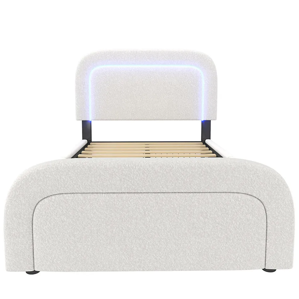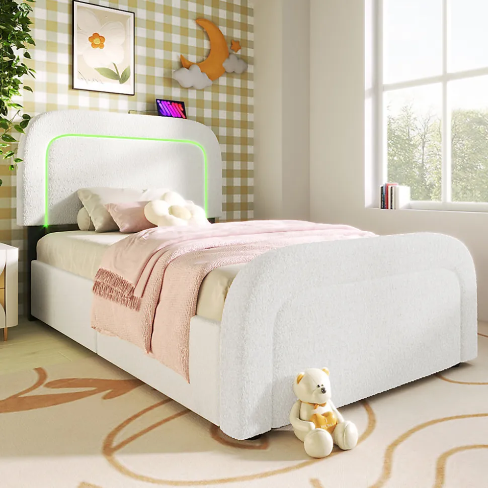Dimensions totales :208×94.5×102.5-112.5(LxLxH)Capacité de charge :300LBSCouleur :blancMatériau :SherpaSurface de couchage :90x200cmNombre de paquets : 2Poids net (kg):31.50kgMontage nécessaire : OuiMatelas inclus : NonStation de charge sur la tête de lit :Nous avons également ajouté des ports de charge USB+Type-C en haut de la tête de lit, ce qui vous permet de charger vos smartphones, tablettes et autres appareils électroniques ou de les charger directement sur le lit. Vous n’avez plus besoin de vous lever pour recharger vos appareils, ce qui vous permet d’économiser du temps et de l’énergie.Éclairage LED pour améliorer la qualité de l’humeur :L’éclairage LED intégré crée une ambiance parfaite et diffuse une lumière apaisante, idéale pour se détendre après une longue journée.Confort luxueux :La silhouette incurvée et les têtes et pieds de lit épais et rembourrés apportent un style rétro à n’importe quelle chambre à coucher, tandis que le faux sherpa douillet offre une expérience de relaxation ultime.Design de rangement :Le Single est équipé de deux tiroirs que vous pouvez placer à gauche ou à droite en fonction de la disposition de la pièce. Il y a suffisamment de place pour ranger les couvre-lits et les housses de couette.Montage efficace :Pour réduire le risque de dommages, ce cadre de lit est expédié dans deux cartons qui peuvent arriver à des jours différents. Les bricoleurs n’ont pas à s’inquiéter car la conception innovante rend le montage facile, surtout lorsqu’il est combiné avec les instructions claires et complètes qui sont incluses avec chaque achat et qui sont également disponibles en ligne.Remarques :En raison des mesures manuelles, une erreur de 2 à 3 cm peut se produire.