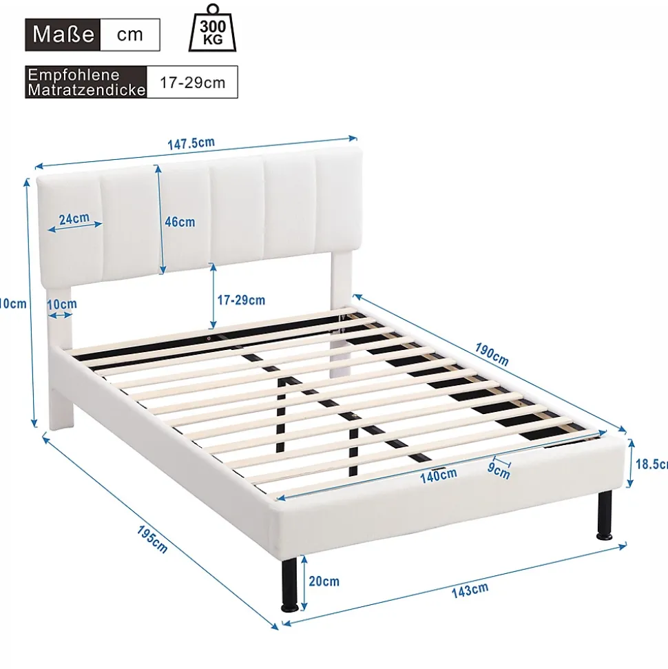 Dimensions totales :195x143x110cm(LxLxH)Capacité de charge :300kgCouleur :beigePoids net :26 kgMatériau du plateau :SherpaHauteur du pied de lit :28.5cmSurface de couchage :140x190cmNombre de paquets : 2Montage nécessaire : OuiType de matelas :sans matelasTissu sherpa confortable : Le tissu sherpa est doux et confortable et vous offre un environnement de sommeil chaud. Sa texture pelucheuse procure une sensation de douceur supplémentaire et rend votre sommeil plus confortable.Sommier à lattes robuste : Le cadre de lit est doté d’un sommier à lattes qui offre un excellent soutien et un grand confort. Le sommier à lattes répartit uniformément la pression, ce qui rend votre sommeil plus confortable tout en garantissant une plus grande durabilité.Conception des pieds en fer : Les pieds en fer du lit sont non seulement solides et durables, mais ils offrent également un soutien stable. La combinaison des pieds en fer forgé et du corps du lit peut donner au lit une esthétique industrielle.Design simple : Le design du lit est simple et élégant, sans décoration inutile et encombrante, reflétant le style moderne et épuré. Ce design ne donne pas seulement au lit un aspect plus frais et plus ordonné, mais il lui permet également de s’adapter plus facilement à différents styles d’habitation.Convient à différents scénarios : Les dimensions de ce lit sont de 140 x 190 cm et il peut être arrangé et utilisé selon les besoins à tout moment. Qu’il s’agisse d’une maison familiale ou d’un appartement, il y a de quoi répondre à vos besoins.Remarques :En raison des mesures manuelles, une erreur de 2 à 3 cm peut se produire. Ce produit sera divisé en deux colis pour la livraison. Il se peut qu’ils n’arrivent pas en même temps. Veuillez patienter.